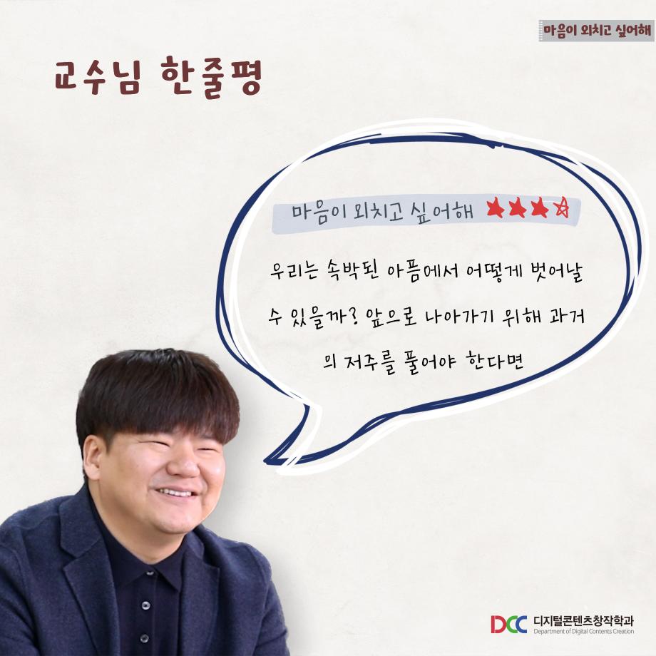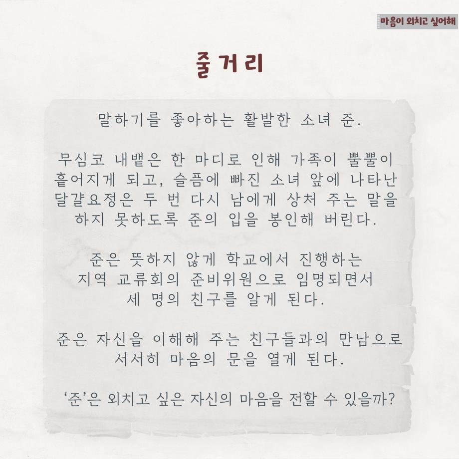 본문 시작 홈으로 MCC News 학과소개 교수소개 학과과정 MCC News MCC SNS 홈페이지가이드 학과 및 재학생 학과 및 재학생 교수 및 졸업생 미디어 정보통 학과 및 재학생 페이스북 트위터 프린트 디콘창이 추천하는 영화 추천 6선 2탄 디지털콘텐츠창작학과 3699 2023-01-02 세명대학교 디지털콘텐츠창작학과가 추천하는 영화 추천 6선 시리즈 두 번째입니다! 2탄 추천 영화는 '마음이 외치고 싶어해'입니다. 😃 영화 추천 시리즈에서는 추천 영화의 줄거리, 스틸컷, 감상 가능한 사이트, 교수님의 한줄평까지 한눈에 볼 수 있습니다. 짧지만 알찬 정보는 담았으니, 다양한 장르의 추천 영화를 감상해 보시고 여러분들의 한줄평을 남겨주세요! 앞으로 올라올 4편도 학우분들의 많은 관심 부탁드립니다❤ 목록 이전제20회 DCC콘텐츠페스티벌 개최! 다음 🐰 2023년 계묘년 희망찬 새해를 맞았습니다! 🐰 담당부서 : 미디어콘텐츠창작학과 담당자 : - 연락처 : 043-649-1741 최종수정일 : 2024-10-26 만족도조사 만족도 조사 이 페이지에서 제공하는 정보에 대하여 만족하시나요? 매우만족 만족 보통 불만족 매우불만족