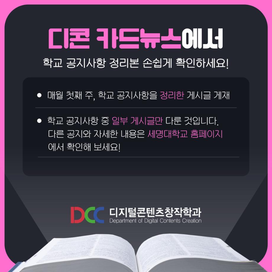 본문 시작 홈으로 MCC News 학과소개 교수소개 학과과정 MCC News MCC SNS 홈페이지가이드 학과 및 재학생 학과 및 재학생 교수 및 졸업생 미디어 정보통 학과 및 재학생 페이스북 트위터 프린트 세명대학교 홈페이지 공지사항 정리 디지털콘텐츠창작학과 3351 2023-07-07 매번 홈페이지 들어가기 귀찮은 분들을 위해 세명대학교 공지사항 요약본을 준비했습니다! 유익한 정보 얻어가시기 바랍니다! *공지사항 중 일부 게시글만 다룬 것입니다. 다른 공지사항이나 자세한 내용은 학교 홈페이지에서 확인 바랍니다 목록 이전🏫 강의실 Before & After 🏫 다음 🍭 오늘의 디콘 17탄 🍭 담당부서 : 미디어콘텐츠창작학과 담당자 : - 연락처 : 043-649-1741 최종수정일 : 2024-10-26 만족도조사 만족도 조사 이 페이지에서 제공하는 정보에 대하여 만족하시나요? 매우만족 만족 보통 불만족 매우불만족