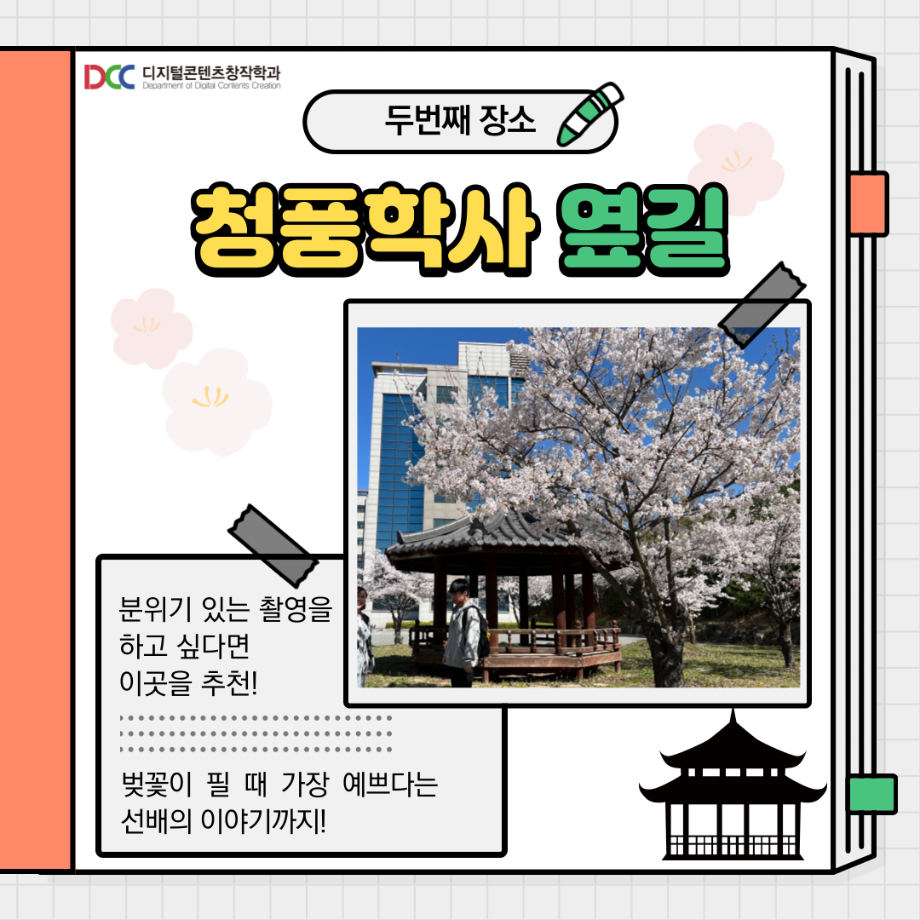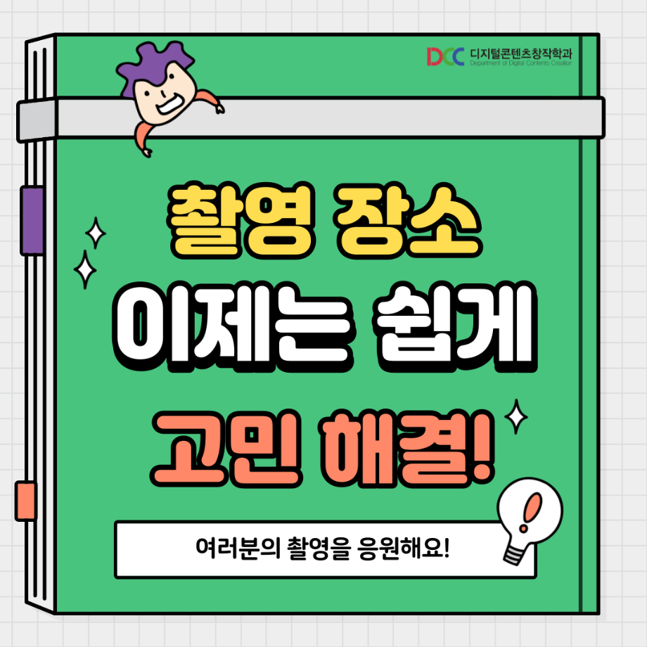 본문 시작 홈으로 MCC News 학과소개 교수소개 학과과정 MCC News MCC SNS 홈페이지가이드 학과 및 재학생 학과 및 재학생 교수 및 졸업생 미디어 정보통 학과 및 재학생 페이스북 트위터 프린트 교내 촬영 장소 추천! 디지털콘텐츠창작학과 4530 2023-08-18 촬영을 해야 하는데 장소가 고민인 디콘창 학생들을 위해 준비했습니다! 학교 안에서의 촬영 장소를 추천해 드려요! 개강이 얼마 남지 않은 만큼 참고하시면 좋을 것 같습니다! 목록 이전🍭 오늘의 디콘 20탄 🍭 다음 📚디콘창 세부전공 소개📚 담당부서 : 미디어콘텐츠창작학과 담당자 : - 연락처 : 043-649-1741 최종수정일 : 2024-10-26 만족도조사 만족도 조사 이 페이지에서 제공하는 정보에 대하여 만족하시나요? 매우만족 만족 보통 불만족 매우불만족