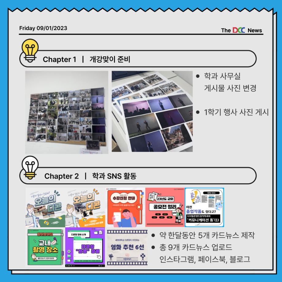 본문 시작 홈으로 MCC News 학과소개 교수소개 학과과정 MCC News MCC SNS 홈페이지가이드 학과 및 재학생 학과 및 재학생 교수 및 졸업생 미디어 정보통 학과 및 재학생 페이스북 트위터 프린트 📝디콘창 학생회 8월 월말결산 디지털콘텐츠창작학과 6641 2023-09-01 학생회가 하는 일이 궁금하시다고요? “디콘창 학생회 월말 결산”을 통해 학생회가 무슨 일을 했는지 알려드립니다🤗 매달 마지막 주에 업로드될 예정이니 많은 관심 부탁드려요!! 목록 이전디콘창이 추천하는 영화 추천 6선 6탄 다음 디지털콘텐츠창작학과, 장학금 마련을 위한 양심책방 운영 담당부서 : 미디어콘텐츠창작학과 담당자 : - 연락처 : 043-649-1741 최종수정일 : 2024-10-26 만족도조사 만족도 조사 이 페이지에서 제공하는 정보에 대하여 만족하시나요? 매우만족 만족 보통 불만족 매우불만족