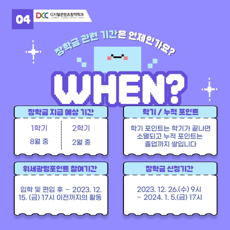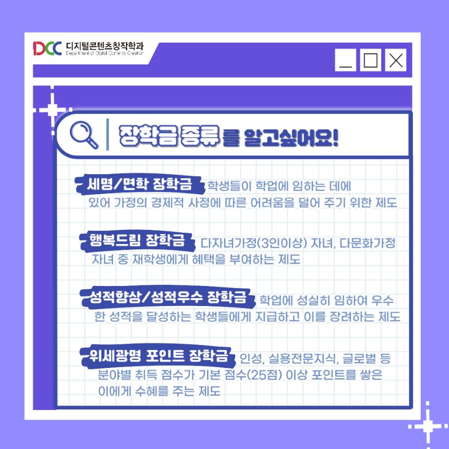 본문 시작 홈으로 MCC News 학과소개 교수소개 학과과정 MCC News MCC SNS 홈페이지가이드 학과 및 재학생 학과 및 재학생 교수 및 졸업생 미디어 정보통 학과 및 재학생 페이스북 트위터 프린트 장학금 받는 꿀팁🎓 디지털콘텐츠창작학과 6040 2023-10-20 장학금 받는 꿀팁🎓 학생회가 알려주는 장학금 받는 꿀팁❗ 장학금 종류뷰터 지급기간까지 알려드려요! 목록 이전학생회가 알려주는 재학생 할인 혜택 다음 디콘창 학생회 소개🤗 담당부서 : 미디어콘텐츠창작학과 담당자 : - 연락처 : 043-649-1741 최종수정일 : 2024-10-26 만족도조사 만족도 조사 이 페이지에서 제공하는 정보에 대하여 만족하시나요? 매우만족 만족 보통 불만족 매우불만족