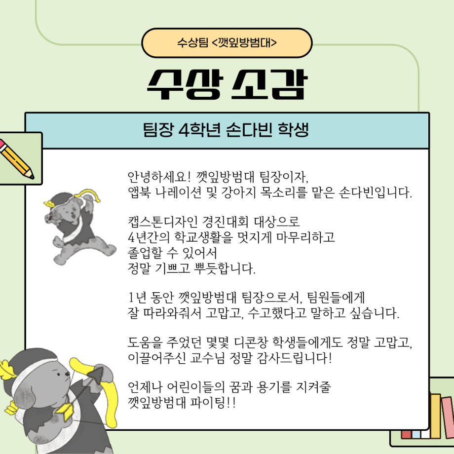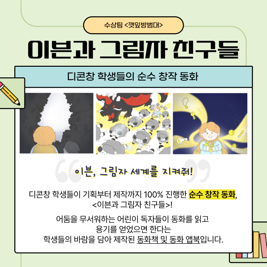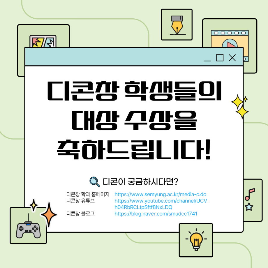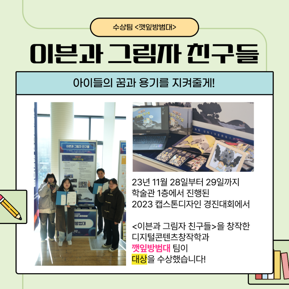 본문 시작 홈으로 MCC News 학과소개 교수소개 학과과정 MCC News MCC SNS 홈페이지가이드 학과 및 재학생 학과 및 재학생 교수 및 졸업생 미디어 정보통 학과 및 재학생 페이스북 트위터 프린트 “이븐과 그림자 친구들”팀이 2023 캡스톤디자인 경진대회에서 대상을 수상하였습니다🎊 디지털콘텐츠창작학과 2545 2023-12-14 이븐과 그림자 친구들에 대한 이야기가 담겨져 있으니 많은 관심 부탁드립니다!! 수상 축하드려요~!! 목록 이전디지털콘텐츠창작학과, 방송 콘텐츠 제작 전문가 특강 및 실습 진행 다음 2023학년도 <커뮤니케이션 통> e-Book 발간! 담당부서 : 미디어콘텐츠창작학과 담당자 : - 연락처 : 043-649-1741 최종수정일 : 2024-10-26 만족도조사 만족도 조사 이 페이지에서 제공하는 정보에 대하여 만족하시나요? 매우만족 만족 보통 불만족 매우불만족