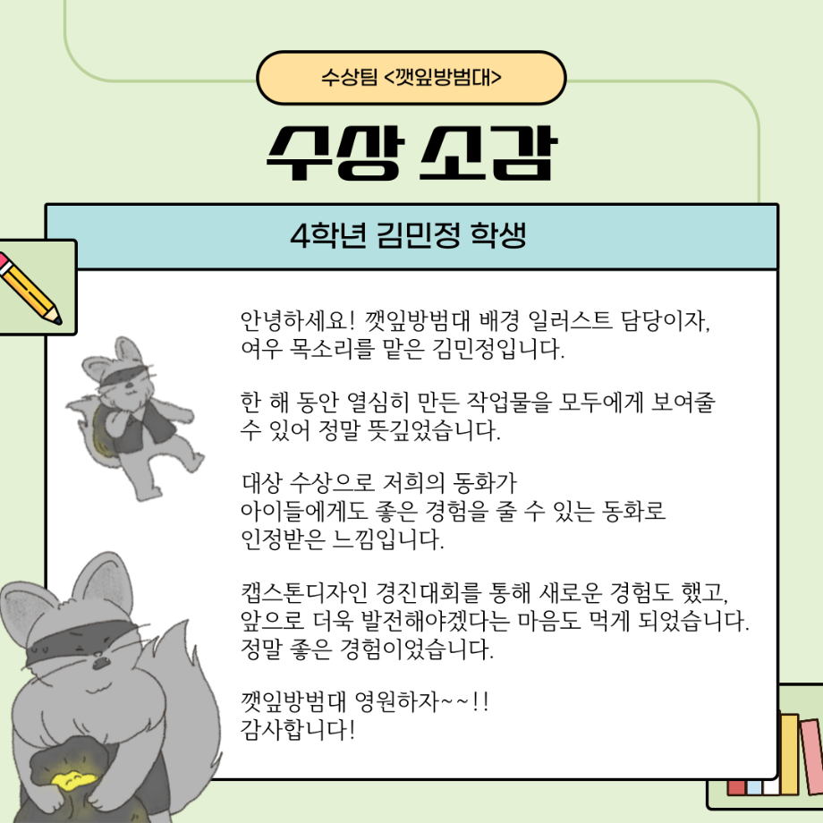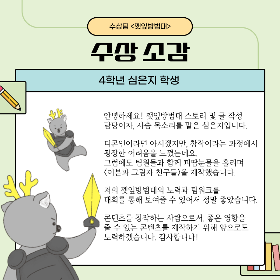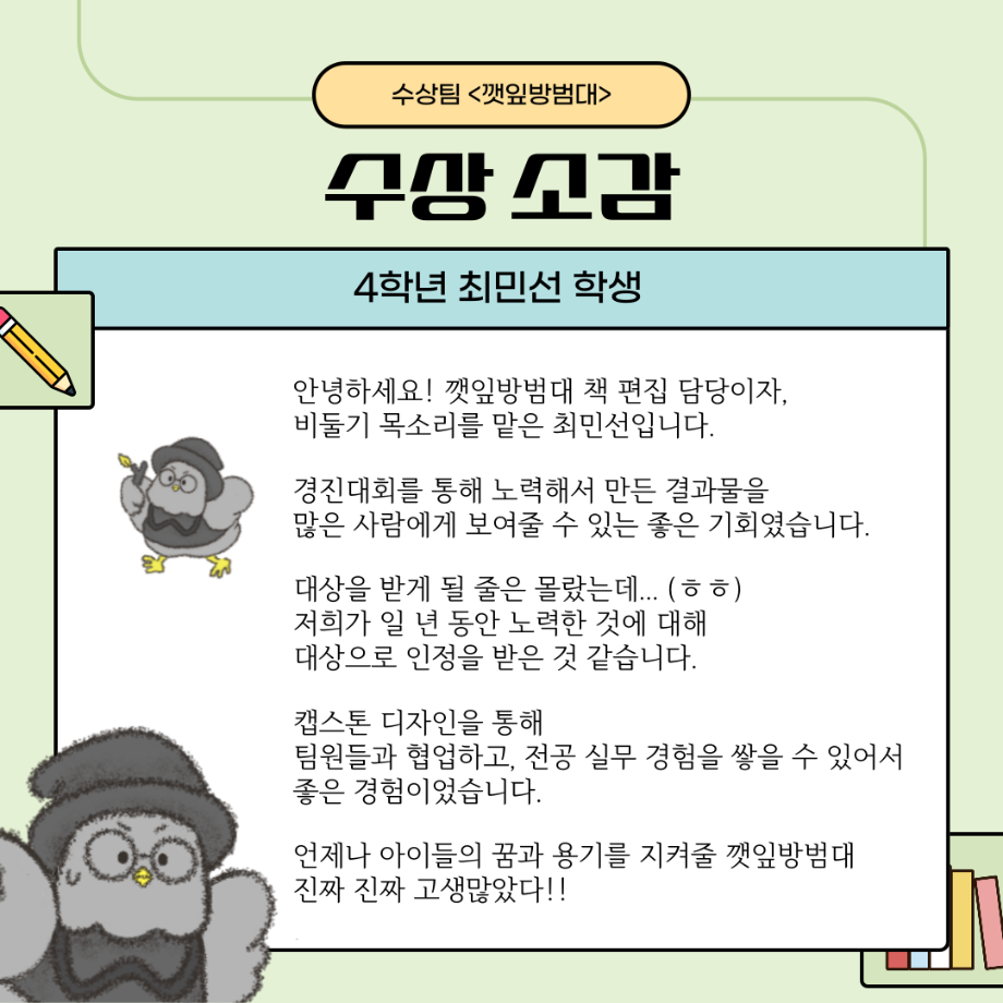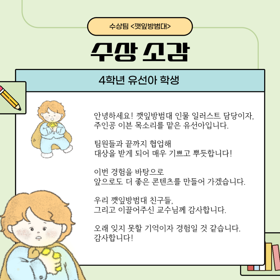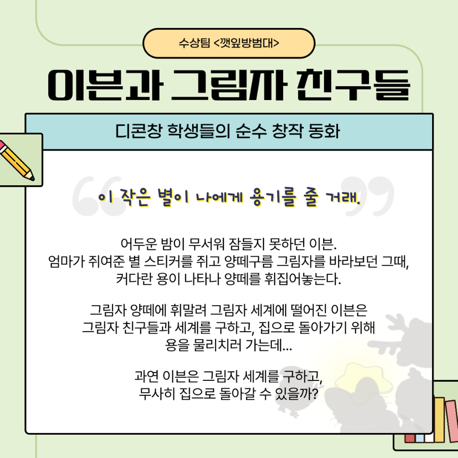 본문 시작 홈으로 MCC News 학과소개 교수소개 학과과정 MCC News MCC SNS 홈페이지가이드 학과 및 재학생 학과 및 재학생 교수 및 졸업생 미디어 정보통 학과 및 재학생 페이스북 트위터 프린트 “이븐과 그림자 친구들”팀이 2023 캡스톤디자인 경진대회에서 대상을 수상하였습니다🎊 디지털콘텐츠창작학과 2545 2023-12-14 이븐과 그림자 친구들에 대한 이야기가 담겨져 있으니 많은 관심 부탁드립니다!! 수상 축하드려요~!! 목록 이전디지털콘텐츠창작학과, 방송 콘텐츠 제작 전문가 특강 및 실습 진행 다음 2023학년도 <커뮤니케이션 통> e-Book 발간! 담당부서 : 미디어콘텐츠창작학과 담당자 : - 연락처 : 043-649-1741 최종수정일 : 2024-10-26 만족도조사 만족도 조사 이 페이지에서 제공하는 정보에 대하여 만족하시나요? 매우만족 만족 보통 불만족 매우불만족