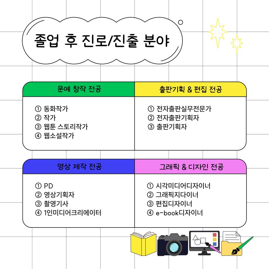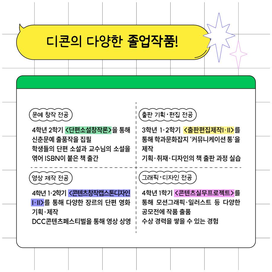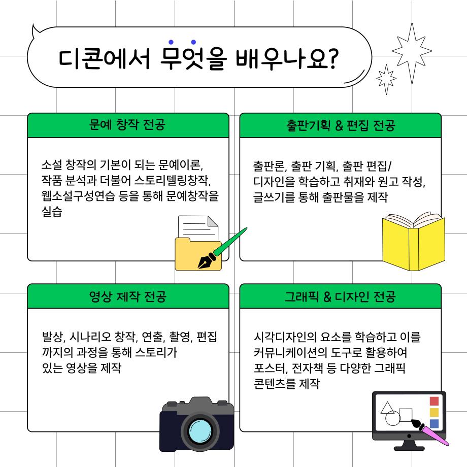 본문 시작 홈으로 MCC News 학과소개 교수소개 학과과정 MCC News MCC SNS 홈페이지가이드 학과 및 재학생 학과 및 재학생 교수 및 졸업생 미디어 정보통 학과 및 재학생 페이스북 트위터 프린트 디지털콘텐츠창작학과를 알고 싶다고? 디지털콘텐츠창작학과 6919 2023-12-29 디지털콘텐츠창작학과를 알고 싶은 예비신입생을 위해 준비했습니다! 디콘에서는 무엇을 배우는지, 어떤 졸업작품을 만드는지 등 궁금한 점을 정리해두었으니 참고하시면 좋을 것 같아요 목록 이전🎞제21회 DCC콘텐츠페스티벌 4학년 졸업작품 상영회🎞 다음 멋진 작품을 뽐내봐! 2023 캡스톤디자인 경진대회 대상: 디지털콘텐츠창작학과 깻잎방범대 팀 담당부서 : 미디어콘텐츠창작학과 담당자 : - 연락처 : 043-649-1741 최종수정일 : 2024-10-26 만족도조사 만족도 조사 이 페이지에서 제공하는 정보에 대하여 만족하시나요? 매우만족 만족 보통 불만족 매우불만족