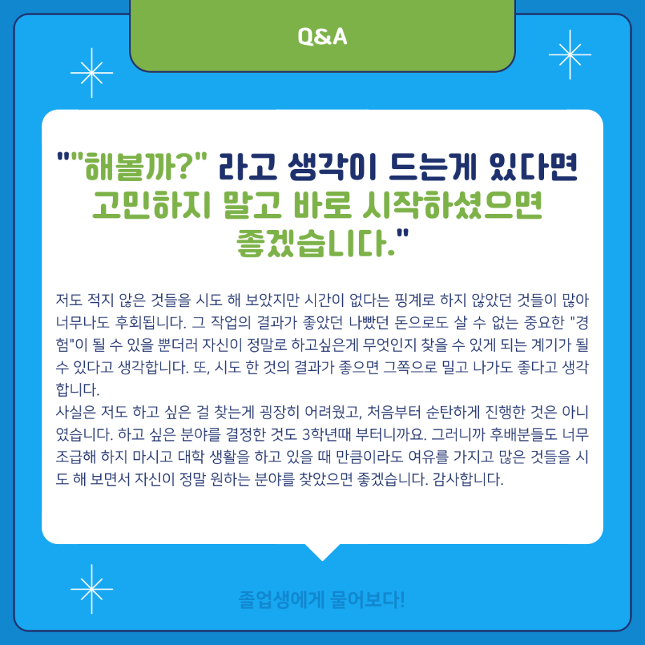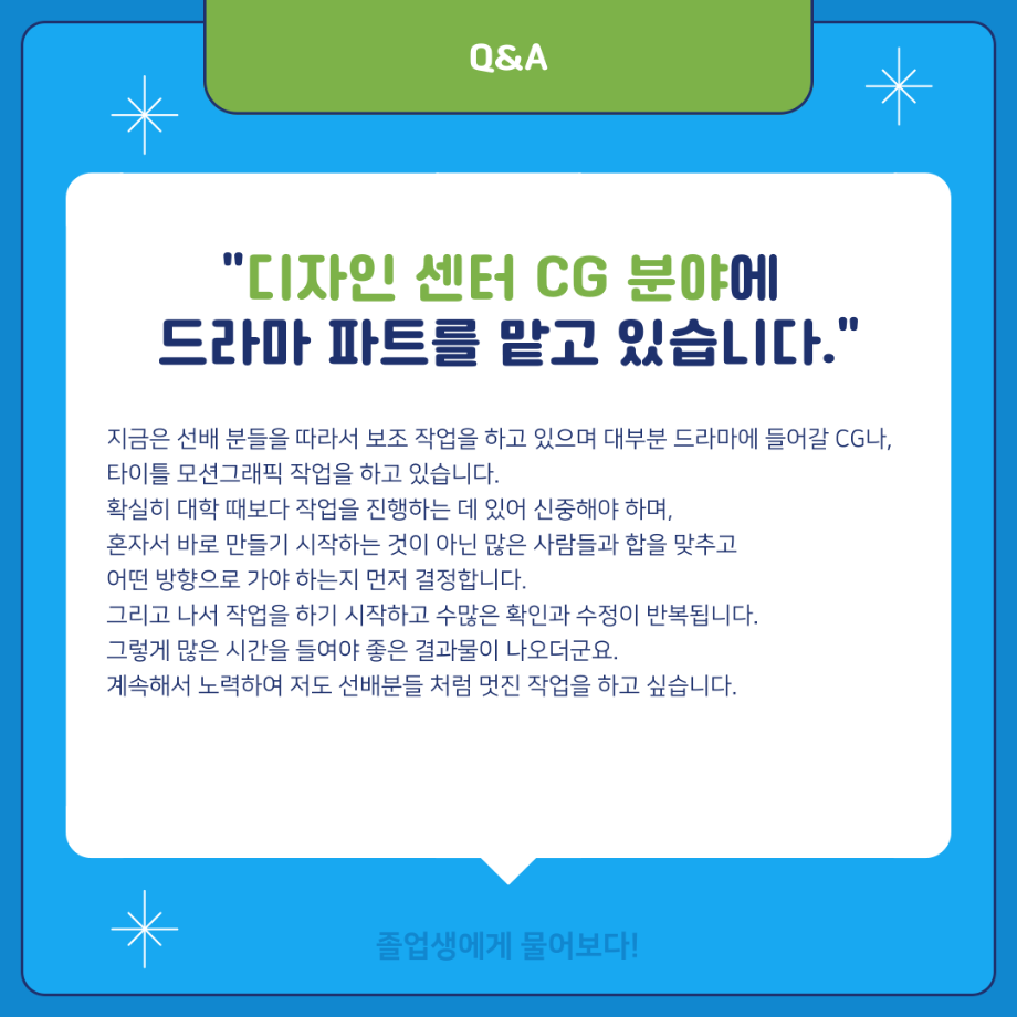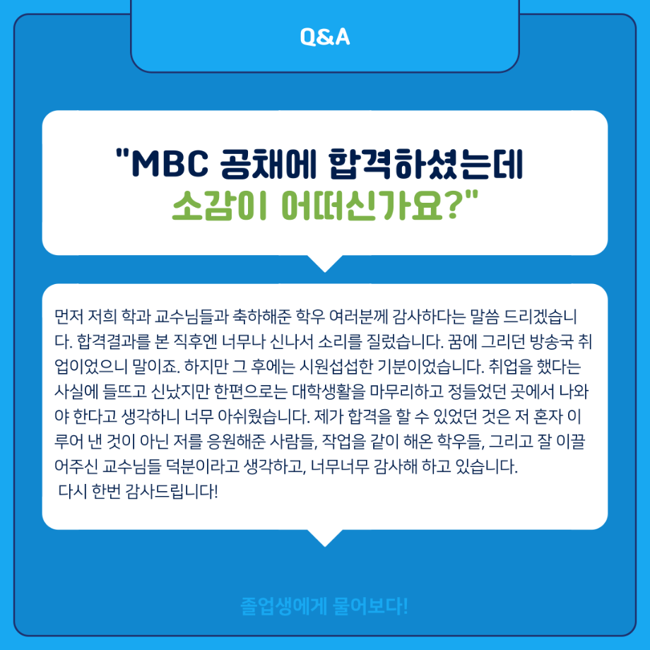 본문 시작 홈으로 MCC News 학과소개 교수소개 학과과정 MCC News MCC SNS 홈페이지가이드 학과 및 재학생 학과 및 재학생 교수 및 졸업생 미디어 정보통 학과 및 재학생 페이스북 트위터 프린트 ‼재학생이 묻고 졸업생이 답하다‼ 디지털콘텐츠창작학과 2857 2024-02-01 MBC 본사 영상미술국 공채시험 합격을 하신 김민재 선배님의 인터뷰 내용을 담았습니다! 재학생분들의 도움이 되길 바라며 많은 관심 부탁드립니다! 목록 이전배고픈 대학생을 통해 알아본 먹거리&맛집&맛팁 소개(2) 다음 👨🎓👩🎓 디지털콘텐츠창작학과 학위수여식 담당부서 : 미디어콘텐츠창작학과 담당자 : - 연락처 : 043-649-1741 최종수정일 : 2024-10-26 만족도조사 만족도 조사 이 페이지에서 제공하는 정보에 대하여 만족하시나요? 매우만족 만족 보통 불만족 매우불만족