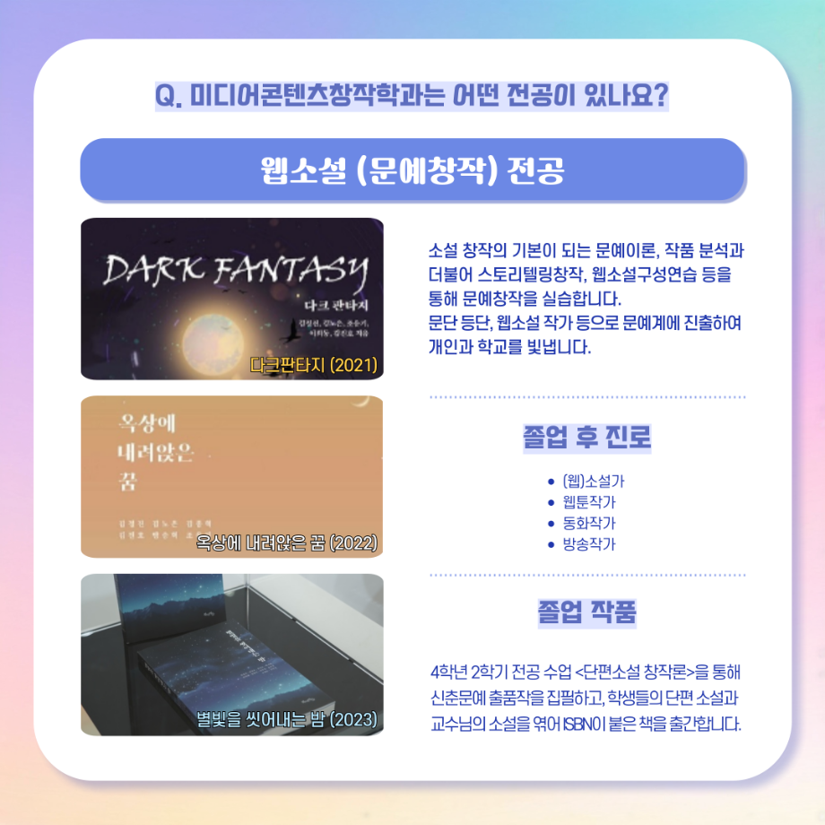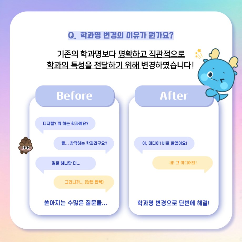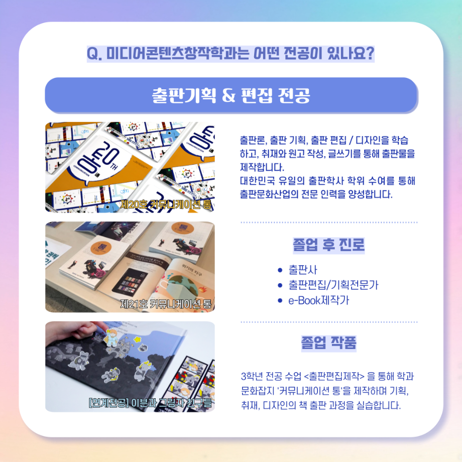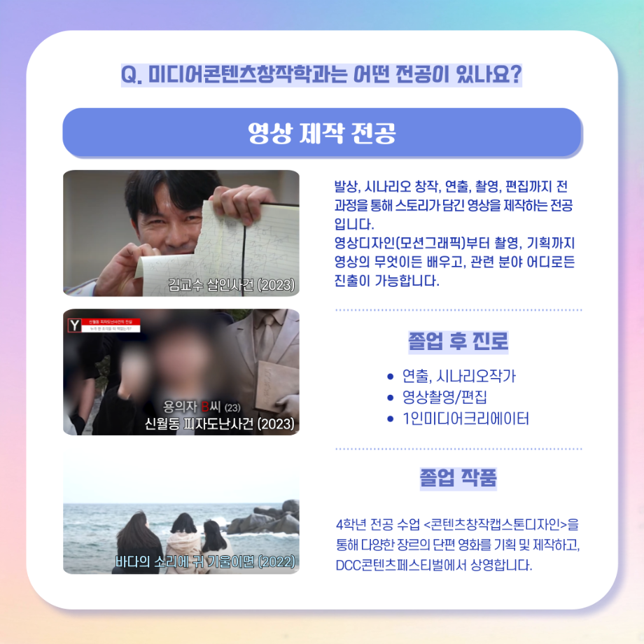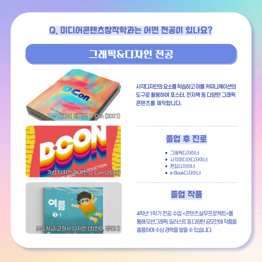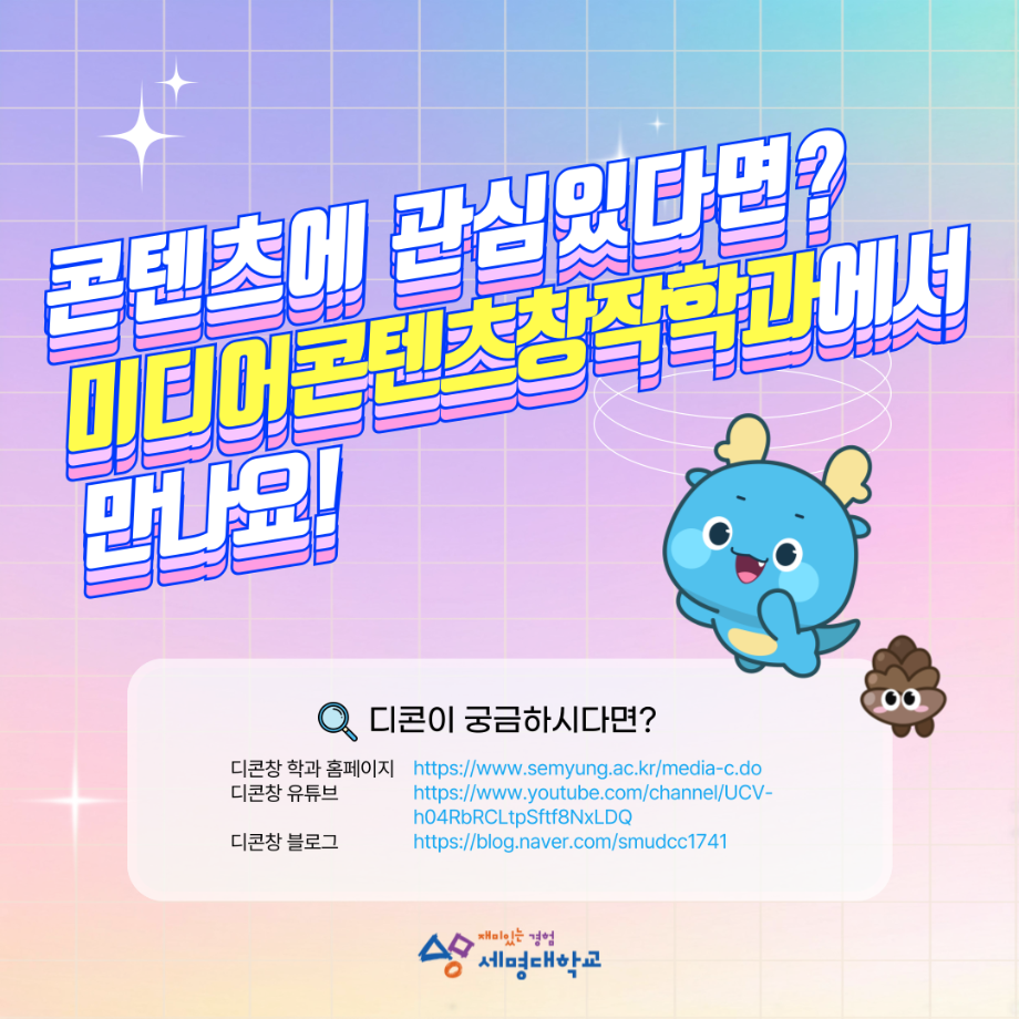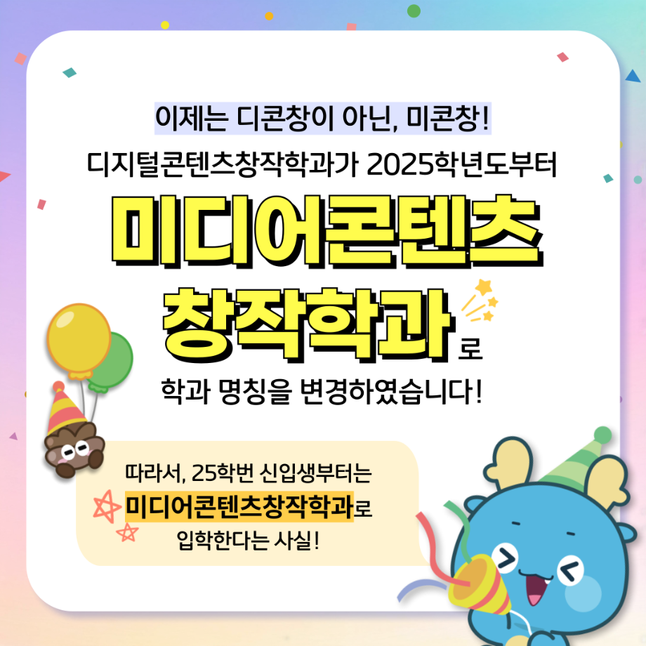 본문 시작 홈으로 MCC News 학과소개 교수소개 학과과정 MCC News MCC SNS 홈페이지가이드 학과 및 재학생 학과 및 재학생 교수 및 졸업생 미디어 정보통 학과 및 재학생 페이스북 트위터 프린트 디콘창, 미디어콘텐츠창작학과로 이름을 변경하다?! 미디어콘텐츠창작학과 2023 2024-09-12 디지털콘텐츠창작학과가 2025년도부터 학과명을 미디어콘텐츠창작학과로 변경하게 되었습니다! 기존 학과명보다 더욱 명확하게 방향성과 특성을 나타내게 되어 정말로 기쁩니다 목록 이전세명대학교에서 알려주는 입시 소식! 다음 2024년 추석맞이 특별 이벤트 담당부서 : 미디어콘텐츠창작학과 담당자 : - 연락처 : 043-649-1741 최종수정일 : 2024-10-26 만족도조사 만족도 조사 이 페이지에서 제공하는 정보에 대하여 만족하시나요? 매우만족 만족 보통 불만족 매우불만족