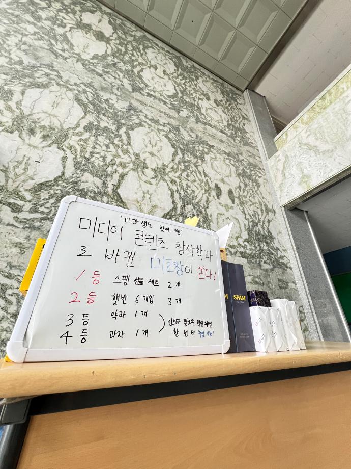 본문 시작 홈으로 MCC News 학과소개 교수소개 학과과정 MCC News MCC SNS 홈페이지가이드 학과 및 재학생 학과 및 재학생 교수 및 졸업생 미디어 정보통 학과 및 재학생 페이스북 트위터 프린트 2024년 추석맞이 특별 이벤트 미디어콘텐츠창작학과 1977 2024-09-13 지난 11일 미디어콘텐츠창작학과 학생회에서 추석맞이 특별 이벤트를 진행했습니다! 추석을 맞이해 학우 여러분들이 뽑기를 통해 다양한 상품을 받아 가셨는데요! 여러분들의 성원에 힘 입어 이벤트 시작 3시간 만에 상품 소진으로 인해 종료하였습니다. 미콘창 학생 뿐만이 아닌 타과 학생 분들도 뽑기에 참여하여 함께 하는 미콘창의 모습을 보여줄 수 있었습니다! 목록 이전디콘창, 미디어콘텐츠창작학과로 이름을 변경하다?! 다음 오랜만에 찾아온 미콘먹거리! 담당부서 : 미디어콘텐츠창작학과 담당자 : - 연락처 : 043-649-1741 최종수정일 : 2024-10-26 만족도조사 만족도 조사 이 페이지에서 제공하는 정보에 대하여 만족하시나요? 매우만족 만족 보통 불만족 매우불만족