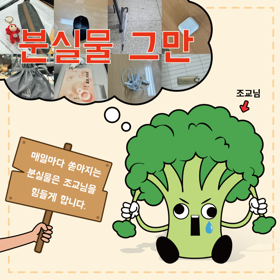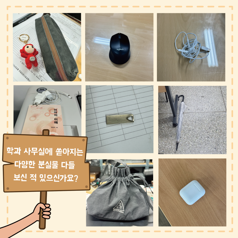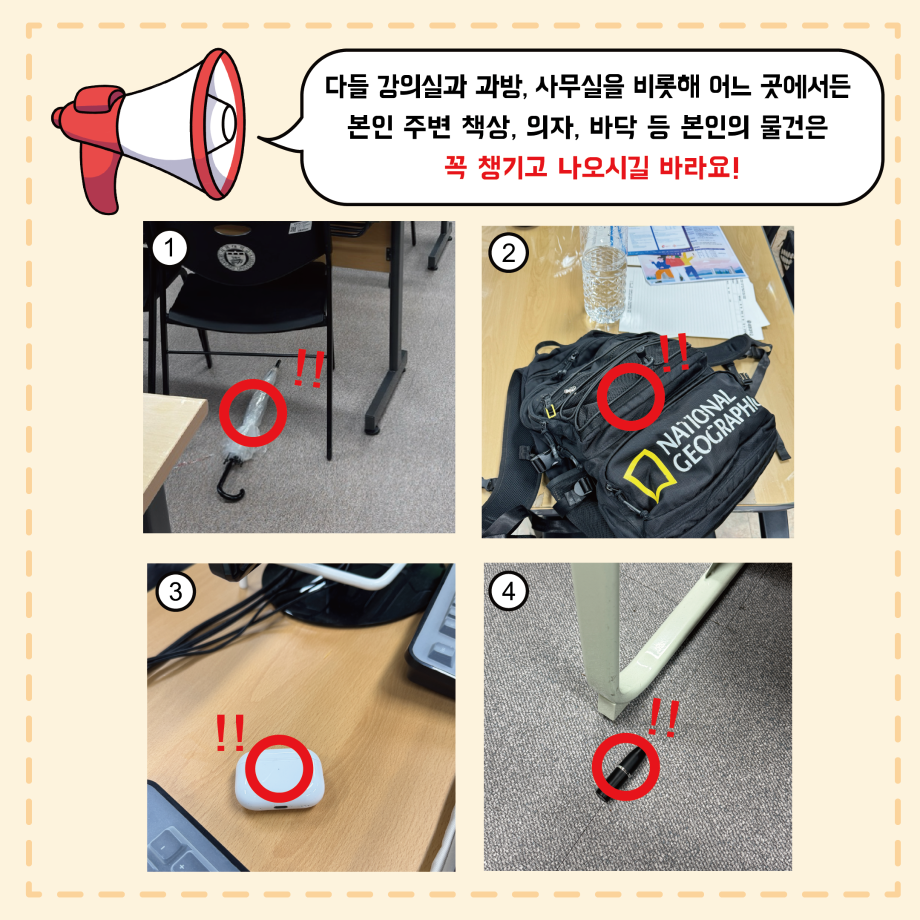 본문 시작 홈으로 MCC News 학과소개 교수소개 학과과정 MCC News MCC SNS 홈페이지가이드 학과 및 재학생 학과 및 재학생 교수 및 졸업생 미디어 정보통 학과 및 재학생 페이스북 트위터 프린트 MCC 내 물건은 내가 지키자! 미디어콘텐츠창작학과 2048 2024-10-24 학과 사무실에 쏟아지는 다양한 분실물 다들 보신 적 있으신가요? 매일마다 쏟아지는 분실물은 조교님을 힘들게 합니다. 다들 교실과 과방, 사무실을 비롯해 어느 곳에서든 본인 주변 책상, 의자, 바닥 등 본인의 물건은 꼭 챙기고 나오시길 바라요! 목록 이전2024년도 세명대학교 인문예술대학 문화콘텐츠 창작공모전 개최 다음 🚪MCC 추리 방탈출 "크라임씬"🔎🚪 담당부서 : 미디어콘텐츠창작학과 담당자 : - 연락처 : 043-649-1741 최종수정일 : 2024-10-26 만족도조사 만족도 조사 이 페이지에서 제공하는 정보에 대하여 만족하시나요? 매우만족 만족 보통 불만족 매우불만족