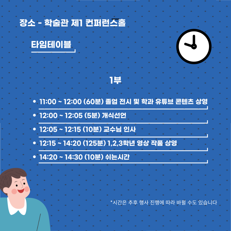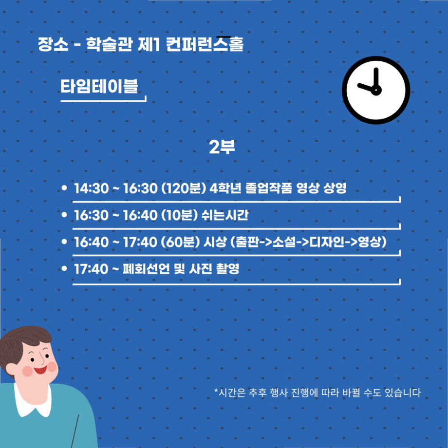 본문 시작 홈으로 MCC News 학과소개 교수소개 학과과정 MCC News MCC SNS 홈페이지가이드 학과 및 재학생 학과 및 재학생 교수 및 졸업생 미디어 정보통 학과 및 재학생 페이스북 트위터 프린트 🎊제22회 DCC 페스티벌🎊 미디어콘텐츠창작학과 2477 2024-11-27 디지털콘텐츠창작학과에서 학기 마지막 행사인 DCC페스티벌을 진행합니다! DCC 페스티벌은 1년동안 학과 학우분들이 제작한 영상, 소설, 디자인, 출판등을 전시 및 상영하는 행사이며 학과의 가장 큰 행사입니다. 일시 - 2024년 12월 3일 화요일 11시 장소 - 학술관 제1컨퍼런스홀 디지털콘텐츠창작학과 이름으로 하는 마지막 행사이자 학우여러분들의 1년동안의 과정, 성과를 볼 수 있는 행사이니 많은 관심과 참여 부탁드립니다! 목록 이전🕵🏻♂미디어콘텐츠창작학과 추리 방탈출🔎 다음 DCC 콘텐츠 페스티벌이 무사히 끝났습니다. 담당부서 : 미디어콘텐츠창작학과 담당자 : - 연락처 : 043-649-1741 최종수정일 : 2024-10-26 만족도조사 만족도 조사 이 페이지에서 제공하는 정보에 대하여 만족하시나요? 매우만족 만족 보통 불만족 매우불만족