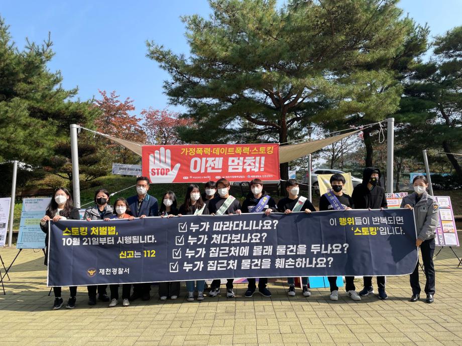 본문 시작 홈으로 커뮤니티 학과안내 교수소개 학과과정 커뮤니티 홈페이지가이드 학과사진첩 공지사항 취업정보 학과사진첩 학과행사 동아리 학생회 교우소식 학과사진첩 페이스북 트위터 프린트 PALETTE 데이트폭력과 스토킹행위 근절을 위한 캠페인 진행 법학과 3754 2021-10-26 세명대학교 법학과(학과장 장성원) 봉사동아리 PALETTE는 2021년 10월 26일(화) 교내 학생회관 앞에서 스토킹처벌법 시행을 맞아 데이트폭력과 스토킹행위 근절을 위한 캠페인을 진행하였다. 이 캠페인에는 세명대학교 인권서포터즈 ‘SMile’과 제천가정폭력상담소, 제천경찰서가 함께 참여하였다. 목록 이전HAN'S 심리상담센터와 상호 교류・협력 협약(MOU) 체결 다음 2021.11.02 경찰 공무원 특강 담당부서 : 법학과 담당자 : - 연락처 : 043-649-1764 최종수정일 : 2024-10-26 만족도조사 만족도 조사 이 페이지에서 제공하는 정보에 대하여 만족하시나요? 매우만족 만족 보통 불만족 매우불만족