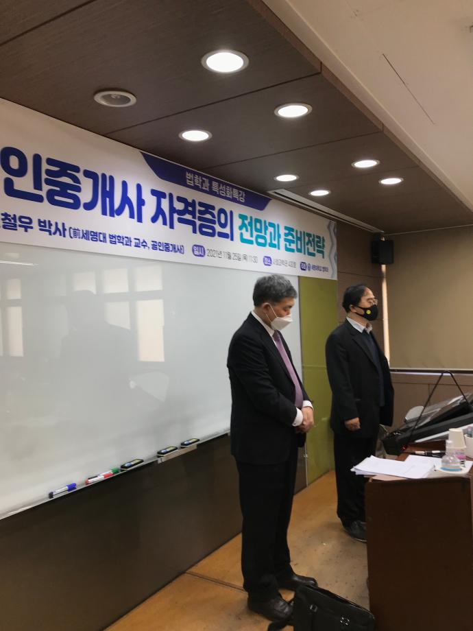 본문 시작 홈으로 커뮤니티 학과안내 교수소개 학과과정 커뮤니티 홈페이지가이드 학과사진첩 공지사항 취업정보 학과사진첩 학과행사 동아리 학생회 교우소식 학과사진첩 페이스북 트위터 프린트 2021 11. 25. 노철우 공인중개사님 특강 법학과 2967 2021-11-25 2021년 11월 25일 前 세명대학교 교수님이셨던 노철우 공인중개사님을 모시고 ' 공인중개사 자격증의 전망과 준비전략' 이라는 주제로 특강을 진행하였습니다. ※본 특강은 코로나19 방역 수칙을 준수하여 진행하였습니다.※ 목록 이전2021. 11. 24 김대연 박사님 특강 다음 2021 11. 26. 신변보호사 자격증(1차) 담당부서 : 법학과 담당자 : - 연락처 : 043-649-1764 최종수정일 : 2024-10-26 만족도조사 만족도 조사 이 페이지에서 제공하는 정보에 대하여 만족하시나요? 매우만족 만족 보통 불만족 매우불만족