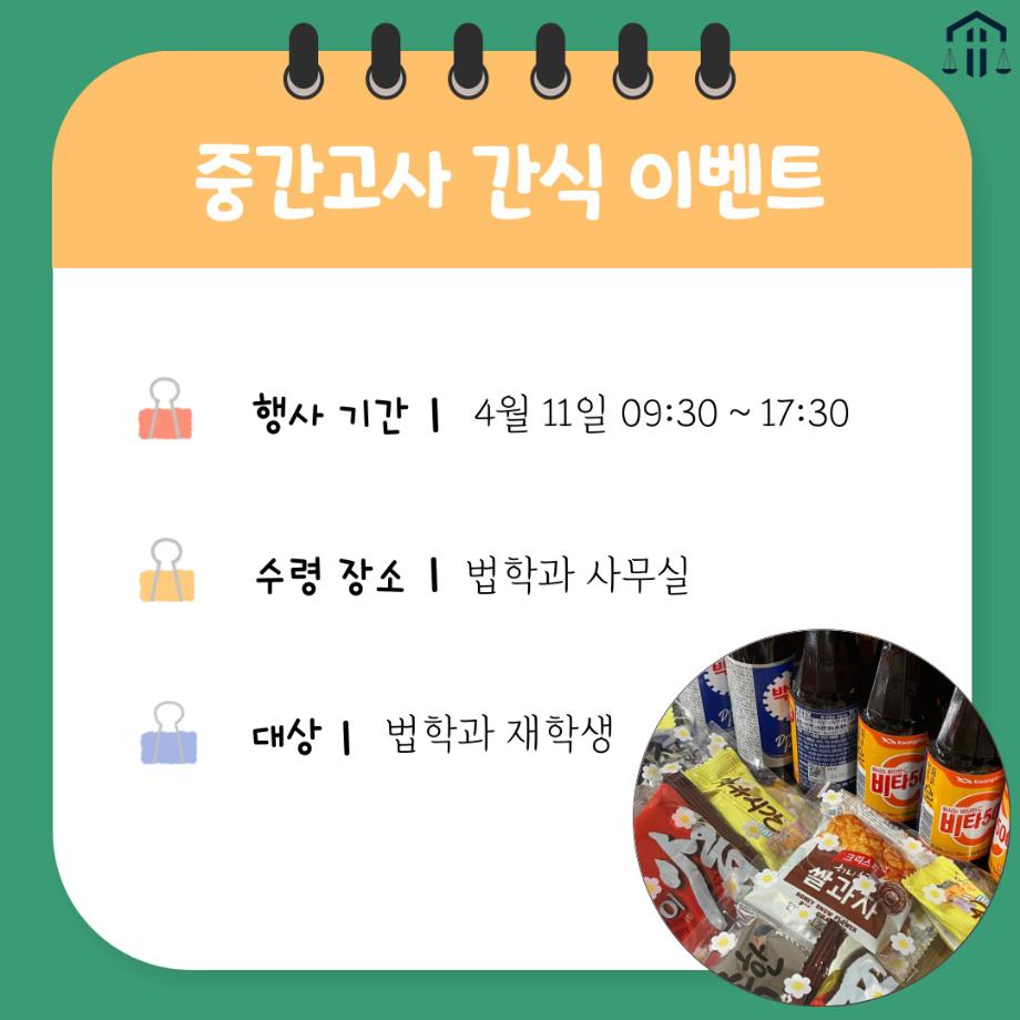 본문 시작 홈으로 커뮤니티 학과안내 교수소개 학과과정 커뮤니티 홈페이지가이드 학과사진첩 공지사항 취업정보 학과사진첩 학과행사 동아리 학생회 교우소식 학과사진첩 페이스북 트위터 프린트 🍫법학과 '하로'의 간식 이벤트🍫 법학과 5315 2023-04-11 🍫법학과 '하로'의 간식 이벤트🍫 🔔EVENT🔔 시험이 얼마 남지 않아서 힘들죠? 🤔 하로가 중간고사 기간 중 법학과 학생분들을 위해 '간식꾸러미'를 준비했어요! :) 소소하지만, 당충전하고 모두 힘내봅시다👍 ✔ 재고 소진 시까지 😆 ✔ 선착순 4월 11일 (화) 09:30~17:30 ✔ 1인 간식꾸러미1개, 음료수1개 세트‼ ✔ 학과 사무실로 오셔서 받아가시면 됩니다👏 목록 이전[법학과 축구동아리 DIKE] 이길 수 있었는데...(중간고사 걱정은 나중에..축구가 먼저다) 다음 [벚꽃세봄] 뿅망치에 줄어든 내 키를 돌리도... 담당부서 : 법학과 담당자 : - 연락처 : 043-649-1764 최종수정일 : 2024-10-26 만족도조사 만족도 조사 이 페이지에서 제공하는 정보에 대하여 만족하시나요? 매우만족 만족 보통 불만족 매우불만족