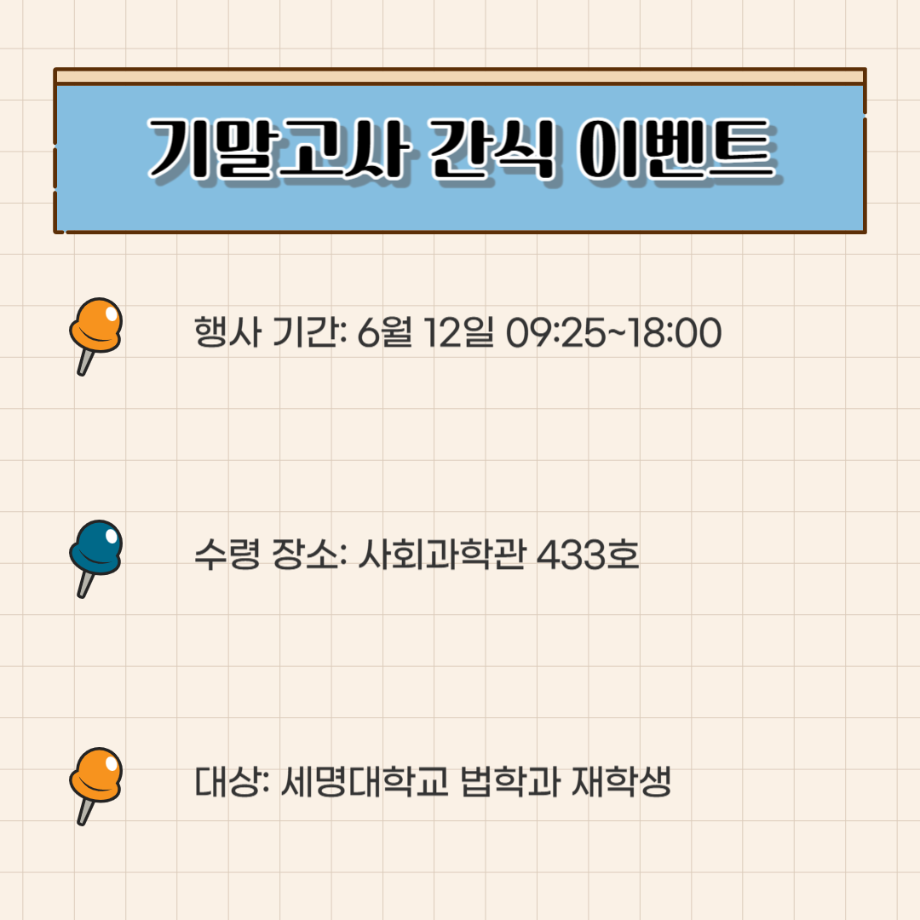 본문 시작 홈으로 커뮤니티 학과안내 교수소개 학과과정 커뮤니티 홈페이지가이드 학과사진첩 공지사항 취업정보 학과사진첩 학과행사 동아리 학생회 교우소식 학과사진첩 페이스북 트위터 프린트 법학과 간식 이벤트🍪 법학과 1556 2025-06-12 법학과 학생회 "다온" 에서 시험으로 지친 학생들을 위해 간식이벤트를 준비했습니다:) 목록 이전2025학년도 법학과 학술캠프 다음 법학과 선배들의 진로 현황 담당부서 : 법학과 담당자 : - 연락처 : 043-649-1764 최종수정일 : 2024-10-26 만족도조사 만족도 조사 이 페이지에서 제공하는 정보에 대하여 만족하시나요? 매우만족 만족 보통 불만족 매우불만족
