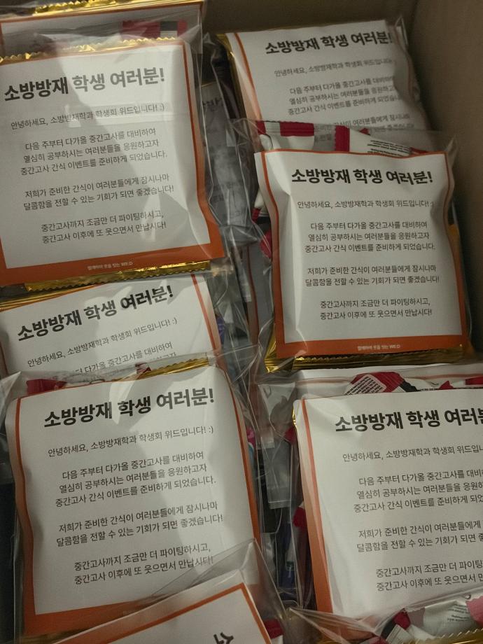 본문 시작 홈으로 커뮤니티 학과소개 교수소개 전공과정 커뮤니티 홈페이지가이드 학과행사 학과공지 채용정보 학사일정 학과행사 학생회 동아리 소방방재학과의 자랑 궁금합니다 수험생 Q&A 학과행사 페이스북 트위터 프린트 2026학년도 1학기 중간고사 간식 이벤트 소방방재학과 112 2026-04-14 2026년 4월 14일 화요일 안녕하세요, 세명대학교 소방방재학과 제21대 학생회 위드입니다! 공학관 209호 앞에서 17시 30분부터 18시까지 2026학년도 1학기 중간고사 간식 이벤트를 진행하였습니다! 수령하지 못하신 분들은 15일에 걸쳐 수령하실 수 있도록 도와드릴 예정입니다. 중간고사까지 다들 파이팅 하시고 좋은 결과 있으시길 바라겠습니다! 목록 이전캡스톤디자인 작품 중앙시장 번영회에 기증 담당부서 : 소방방재학과 담당자 : - 연락처 : 043-649-1787 최종수정일 : 2024-10-26 만족도조사 만족도 조사 이 페이지에서 제공하는 정보에 대하여 만족하시나요? 매우만족 만족 보통 불만족 매우불만족
