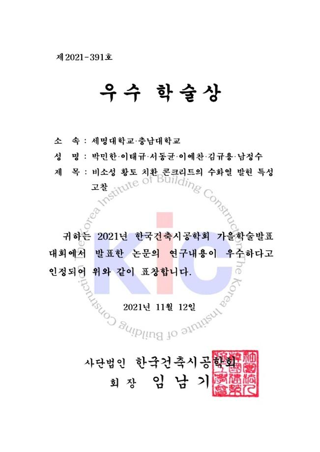 소방방재학과 학석사 통합과정 박민한은 「비소성 황토 치환 콘크리트의 수화열 발현 특성 고찰」이라는 논문을 통해 탄소중립 정책에 기여하기 위한 콘크리트 특성에 대한 연구를 진행했다.