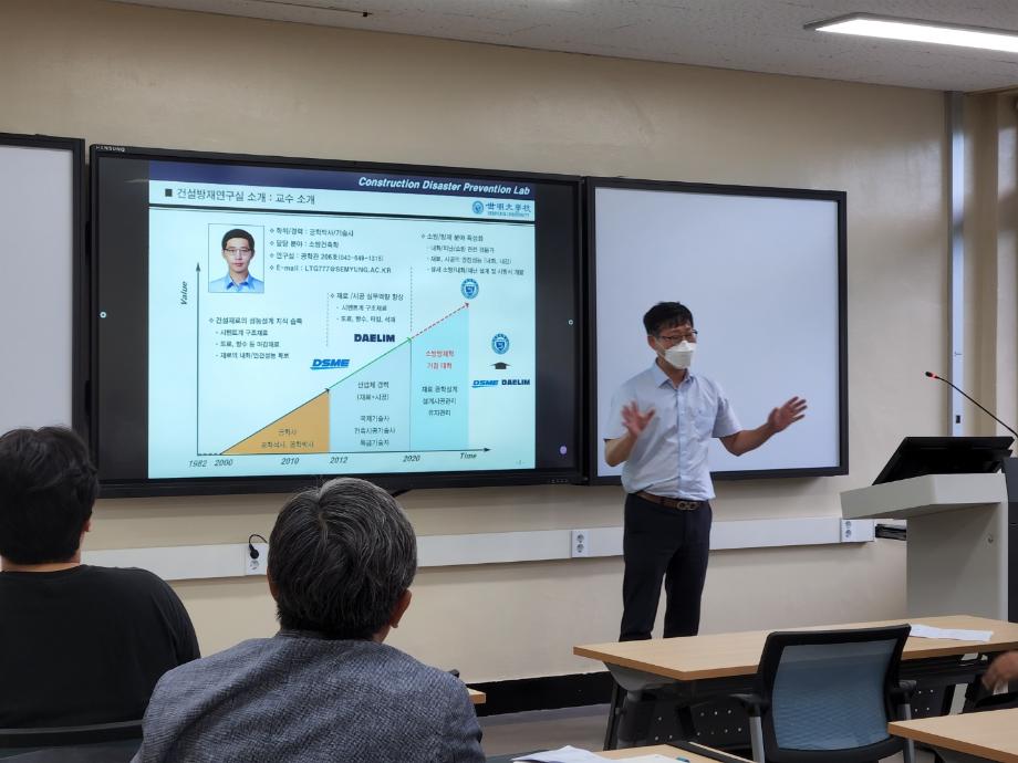 연합 세미나에서는 세명대학교 소방 IT 융합연구실의 최수기 학생, 강원대학교 방재전문대학원 김승준 학생, 세명대학교 건설방재연구실의 김원창 학생 순서로 연구실 소개 및 세미나 발표가 진행되었습니다.