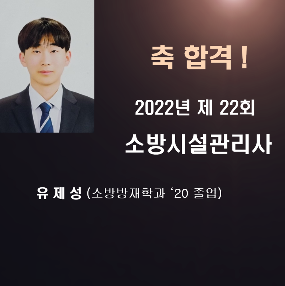 2022년 제22회 소방시설 관리사에 유제성('20졸업), 황정하( '20졸업) 졸업생이 최종 합격하였습니다.