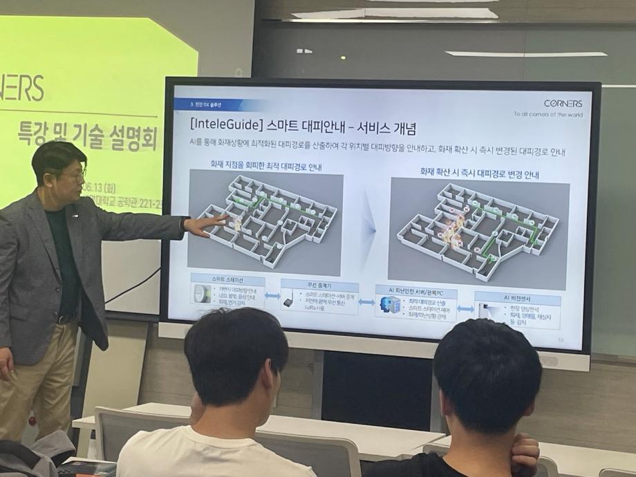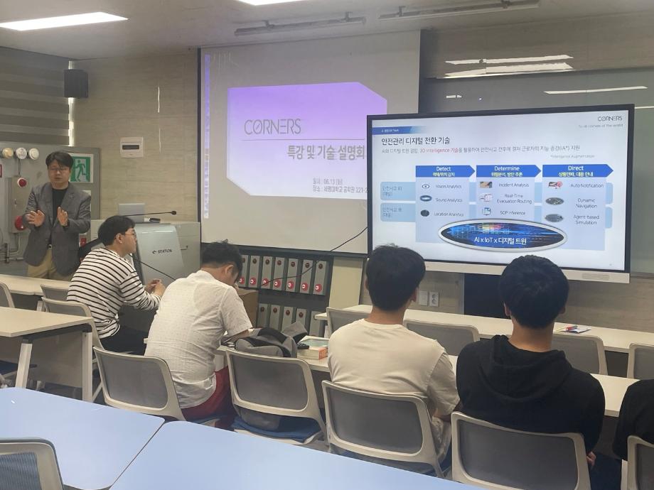 본문 시작 홈으로 커뮤니티 학과소개 교수소개 전공과정 커뮤니티 홈페이지가이드 학과행사 학과공지 채용정보 학사일정 학과행사 동아리 소방방재학과의 자랑 궁금합니다 수험생 Q&A 학과행사 페이스북 트위터 프린트 2023년 (주)코너스 특강 및 기술 설명회 소방방재학과 12306 2023-06-13 2023년 6월 13일 (화)에 (주)코너스에서 세명대학교에 방문하여 특강 및 기술 설명회를 진행하였습니다. 세명대학교 학부생과 대학원생이 청강하였으며, 코너스가 연구하고, 보유하고 있는 기술인 AI, IOT, 디지털 트윈 기술과 스마트 안전 솔루션에 대해 설명하였으며 향후 코너스가 가고자 하는 길에 대해서도 밝히면서, 세명대학교와 함께 걸을 수 있는 길에 대해서 제시하였습니다. 강의를 제공해주신 (주) 코너스 분들에게 감사드립니다. 목록 이전2023년 재난현장 구급대응훈련 다음 2022학년도 학위 수여식 담당부서 : 소방방재학과 담당자 : - 연락처 : 043-649-1787 최종수정일 : 2024-10-26 만족도조사 만족도 조사 이 페이지에서 제공하는 정보에 대하여 만족하시나요? 매우만족 만족 보통 불만족 매우불만족