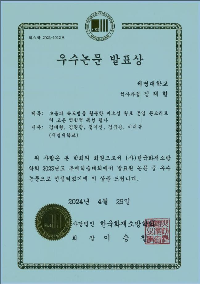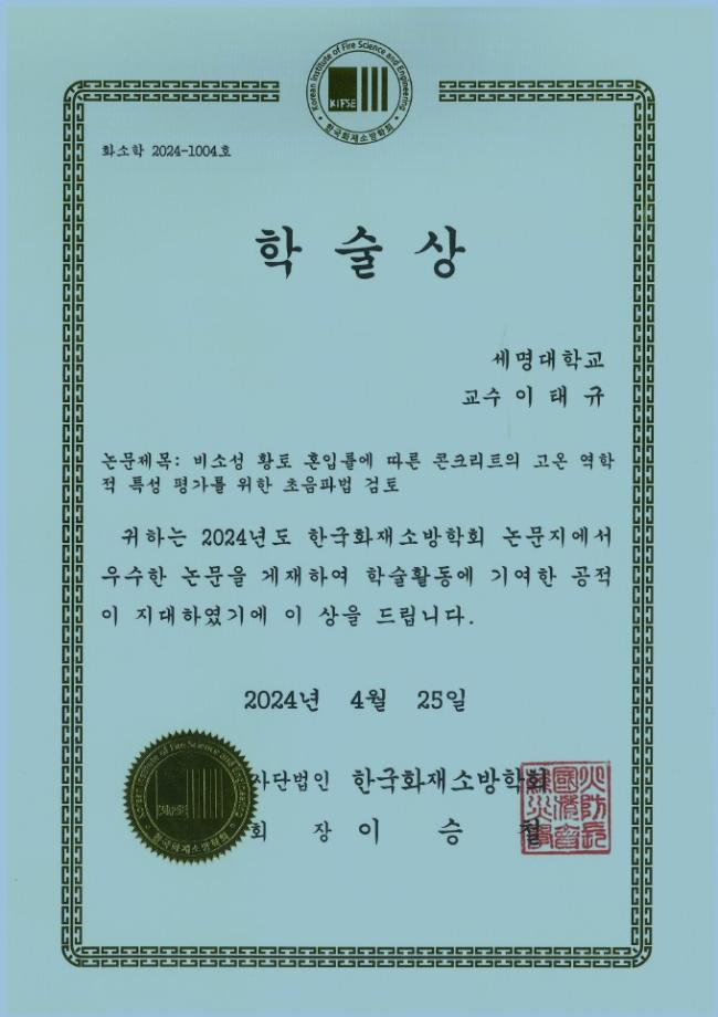 2024년 한국화재소방학회에서 이태규 교수님의 『비소성 황토 혼입률에 따른 콘크리트의 고온 역학적 특성 평가를 위한 초음파법 검토』 논문이 학회에서 우수한 논문으로 인정받으며, 공을 기여하였기에 학술상을 수여받았습니다.