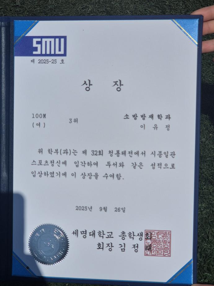 본문 시작 홈으로 커뮤니티 학과소개 교수소개 전공과정 커뮤니티 홈페이지가이드 학과행사 학과공지 채용정보 학사일정 학과행사 동아리 소방방재학과의 자랑 궁금합니다 수험생 Q&A 학과행사 페이스북 트위터 프린트 2025학년도 제32회 청룡체전 소방방재학과 소방방재학과 1831 2025-09-23 2025년 9월 23일 ~9월 25일 제32회 청룡체전 기간동안 여자 피구, 남자 축구, 남자 농구, 혼성 계주, 여자 100m, 남자 100m 참가하였습니다. 선수분들 모두 수고하셨고, 응원해주신 학우분들 감사드립니다! 목록 이전KICT 화재안전연구소 견학 다음 2026학년도 세명대학교 소방방재학과 꿈 설계학기 담당부서 : 소방방재학과 담당자 : - 연락처 : 043-649-1787 최종수정일 : 2024-10-26 만족도조사 만족도 조사 이 페이지에서 제공하는 정보에 대하여 만족하시나요? 매우만족 만족 보통 불만족 매우불만족