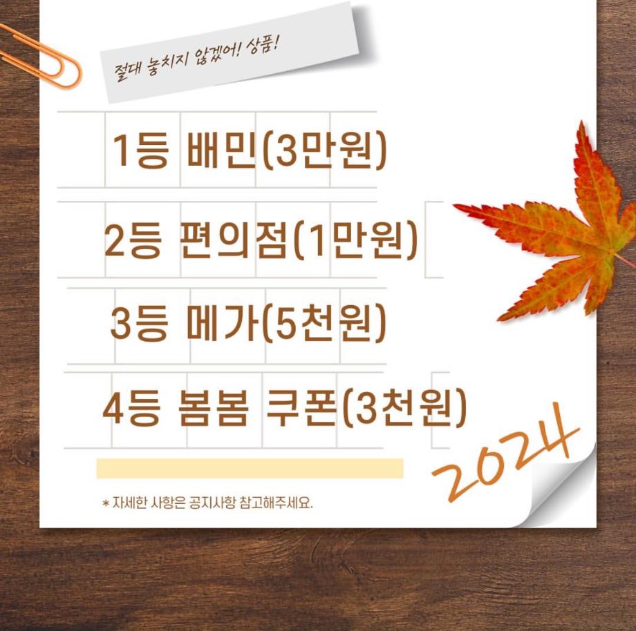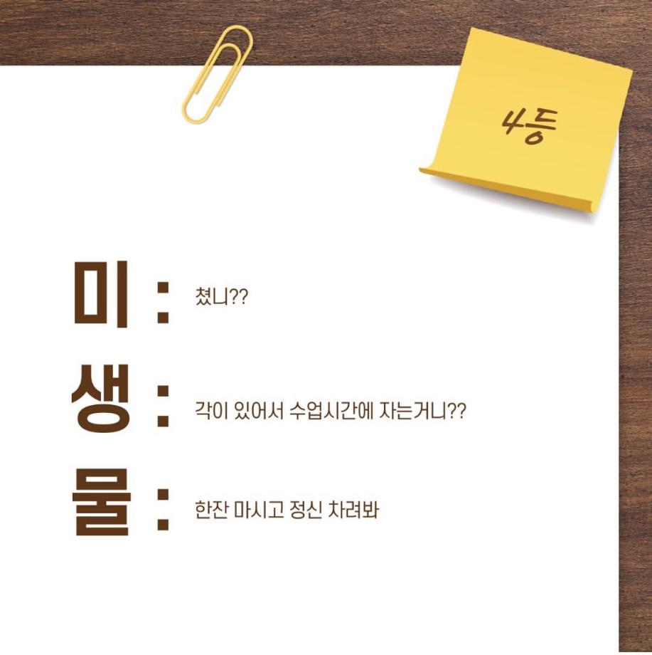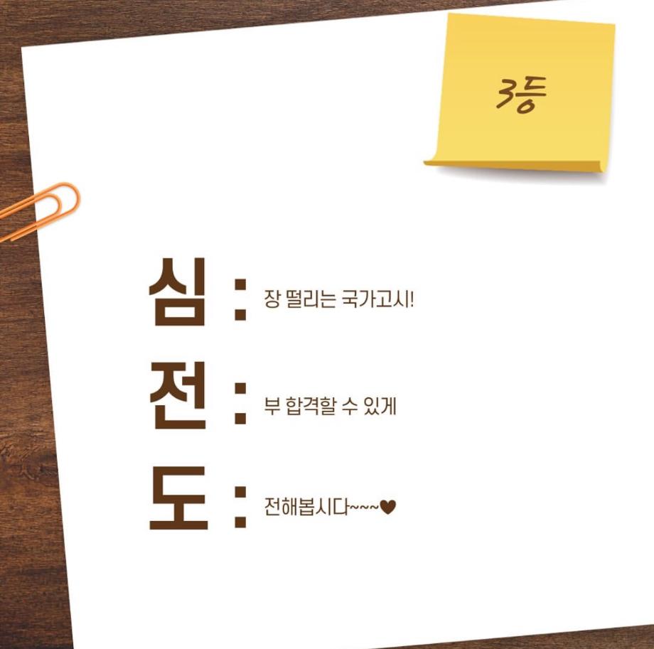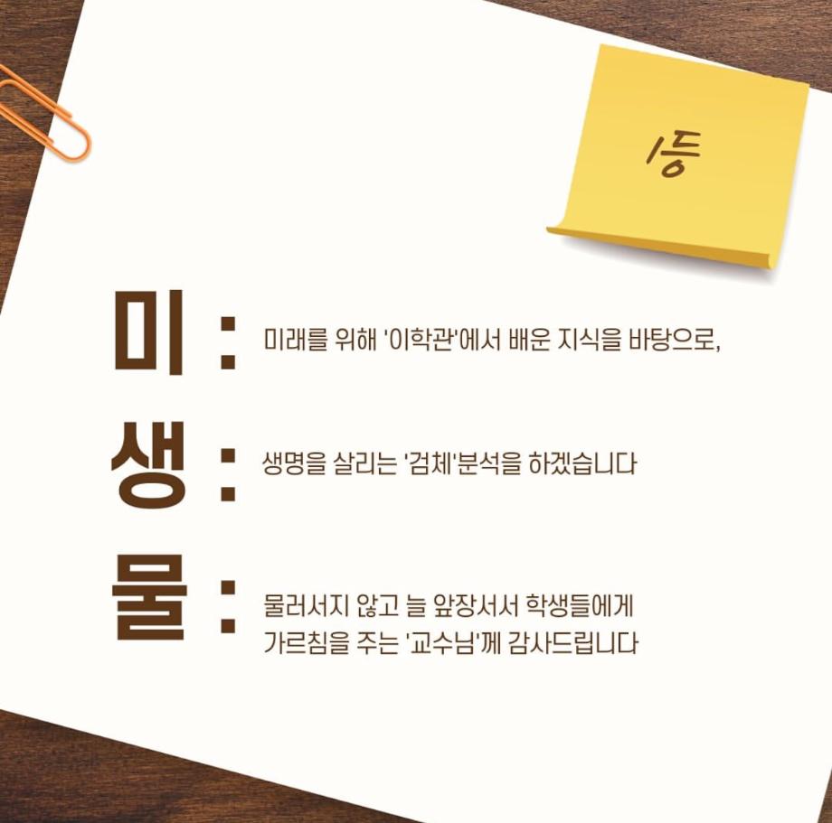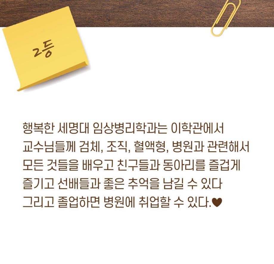 본문 시작 9월 학과 문장만들기 임상병리학과 2288 2024-10-03 9월 학과 개설된 달 기념 3행시, 문장 만들기 이벤트 우수작 총 15개를 선정하였지만 사진 제한이 있어 다 올리지는 못하였습니다 ! 상품은 다음 주 중으로 증정해 드릴 예정입니다 :) 이번 이벤트에 많은 관심을 가져주셔서 감사합니다. 다음에도 좋은 이벤트가 기다리고 있으니 기대해주시길 바랍니다 ! 목록 이전헌혈 버스 다음 중간고사 학용품 이벤트 담당부서 : 임상병리학과 담당자 : - 연락처 : 043-649-1537 최종수정일 : 2024-10-26 만족도조사 만족도 조사 이 페이지에서 제공하는 정보에 대하여 만족하시나요? 매우만족 만족 보통 불만족 매우불만족