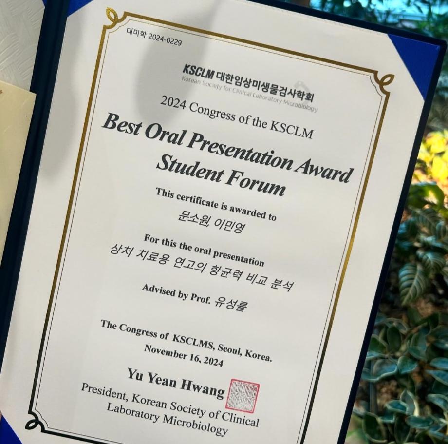 본문 시작 KSCLM 대한미생물검사학회 최우수상 임상병리학과 3207 2024-11-21 세명대학교 임상병리학과 이민영,문소원 학생이 지난 11월 16일 KSCLM 대한미생물검사학괴에서 '상처 치료제의 항균력 비교 분석' 이라는 주제로 발표하여 최우수상을 수상하였습니다. 앞으로도 많은 학생이 다양한 행사와 연구에 참여하여 많은 성과를 얻어갔으면 합니다! 다시 한번 수상을 진심으로 축하합니다 !! 목록 다음 헌혈 버스 오는 날 이전졸업 선물 이벤트 담당부서 : 임상병리학과 담당자 : - 연락처 : 043-649-1537 최종수정일 : 2024-10-26 만족도조사 만족도 조사 이 페이지에서 제공하는 정보에 대하여 만족하시나요? 매우만족 만족 보통 불만족 매우불만족