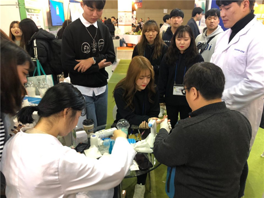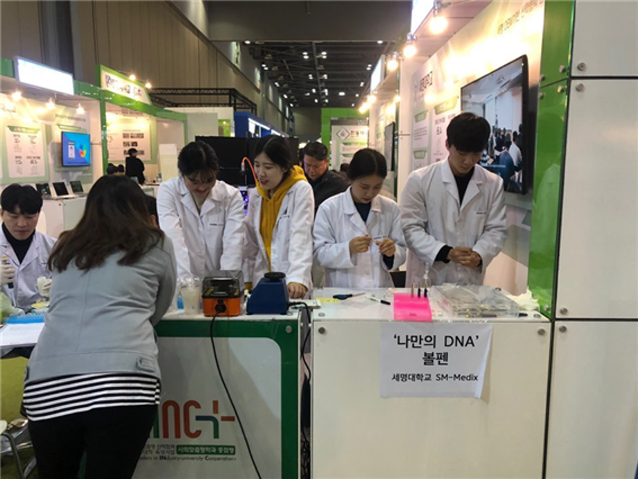 11월 6일부터 8일까지 일산 KINTEX 제1전시장에서 대학과 산업체의 협력을 통해 창출한 신지식과 첨단기술, 창의적 인재양성 과정 등 산학현장의 열정과 노력, 비전과 흐름, 한계를 넘는 혁신과 포용성장을 함께 참여하여 공유하고 소통하고 제시하는 산학 모두의 축제인 2019 산학협력 EXPO에 LINC+ 사업단 임상병리학과 SM Medix가 작년에 이어 참가하였습니다. 부스 방문객의 적은 혈액으로부터 DNA를 추출하여 예쁜 볼펜에 넣어 각인하여 제공하였습니다. 다른 부스보다 인기가 많아 DNA 추출도 많이 하고 볼펜도 많이 만들어야 했지만 동아리 학생들과 함께 하는 뜻깊은 행사가 되었습니다.