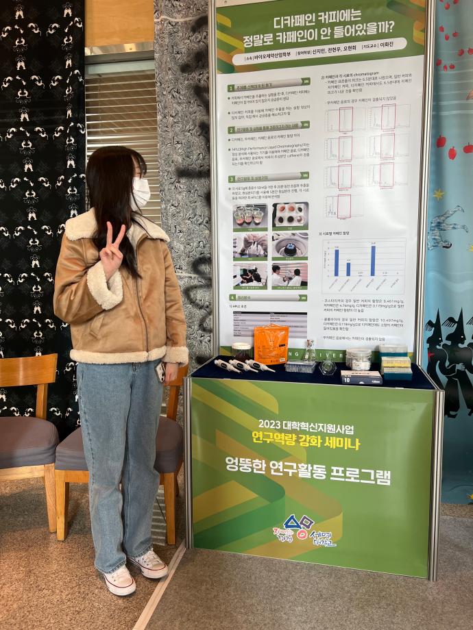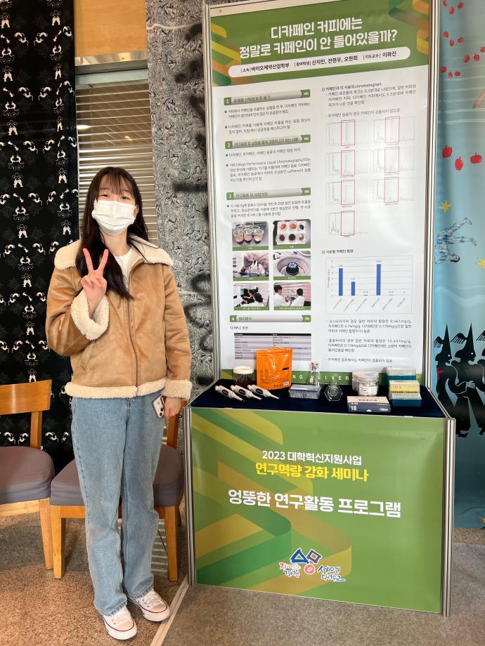 본문 시작 홈으로 학부자료실 학부소개 교육과정 학부공지게시판 학부자료실 홈페이지가이드 학부행사 및 사진게시판 학부행사 및 사진게시판 학생회 소개 학부행사 및 사진게시판 페이스북 트위터 프린트 2023 엉뚱한 연구 결과 발표회 바이오제약산업학부 3347 2023-11-28 우리 학부 신지민, 전현우, 오현희 학생이 이화진 교수의 지도를 받아 진행한 '디카페인 커피에는 정말로 카페인이 안 들어 있을까? '결과를 2023년 11월 28일 세명대학교 학술관에서 발표하였다. 목록 이전의약품 인허가(RA) 전문가 양성과정 다음 의약품 인허가(RA) 전문가 양성과정 1차 담당부서 : 바이오제약산업학부 담당자 : - 연락처 : 043-649-1729 최종수정일 : 2024-10-26 만족도조사 만족도 조사 이 페이지에서 제공하는 정보에 대하여 만족하시나요? 매우만족 만족 보통 불만족 매우불만족