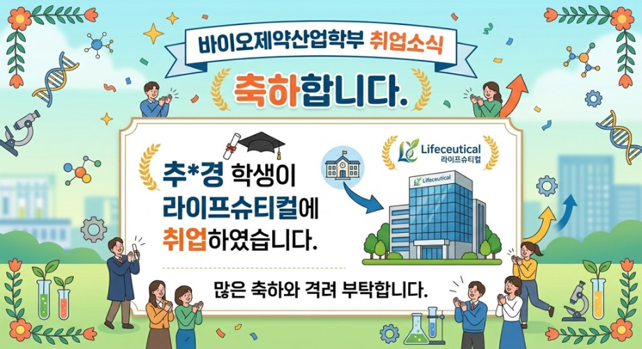 본문 시작 홈으로 학부자료실 학부소개 교육과정 학부공지게시판 학부자료실 홈페이지가이드 학부행사 및 사진게시판 학부행사 및 사진게시판 학생회 소개 학부행사 및 사진게시판 페이스북 트위터 프린트 축하합니다. 추*경 학생이 라이프 슈티컬에 취업하였습니다. 바이오제약산업학부 8 2026-04-27 축하합니다. 추*경 학생이 라이프 슈티컬에 취업하였습니다. 목록 이전GC-MS 기기 활용 활동 다음 축하합니다. 이*서 학생이 시마즈사이언티픽코리아에 취업하였습니다. 담당부서 : 바이오제약산업학부 담당자 : - 연락처 : 043-649-1729 최종수정일 : 2024-10-26 만족도조사 만족도 조사 이 페이지에서 제공하는 정보에 대하여 만족하시나요? 매우만족 만족 보통 불만족 매우불만족