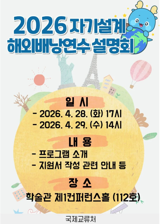 본문 시작 홈으로 학부자료실 학부소개 교육과정 학부공지게시판 학부자료실 홈페이지가이드 학부행사 및 사진게시판 학부행사 및 사진게시판 학생회 소개 학부행사 및 사진게시판 페이스북 트위터 프린트 2026 자기설계 해외배낭연수 설명회 시행 안내 바이오제약산업학부 7 2026-04-27 2026 자기설게 해외배낭연수와 관련하여 설명회를 진행하고자 하오니 재학생 여러분의 많은 관심과 참여를 부탁드립니다. 목록 이전축하합니다. 이*서 학생이 시마즈사이언티픽코리아에 취업하였습니다. 담당부서 : 바이오제약산업학부 담당자 : - 연락처 : 043-649-1729 최종수정일 : 2024-10-26 만족도조사 만족도 조사 이 페이지에서 제공하는 정보에 대하여 만족하시나요? 매우만족 만족 보통 불만족 매우불만족
