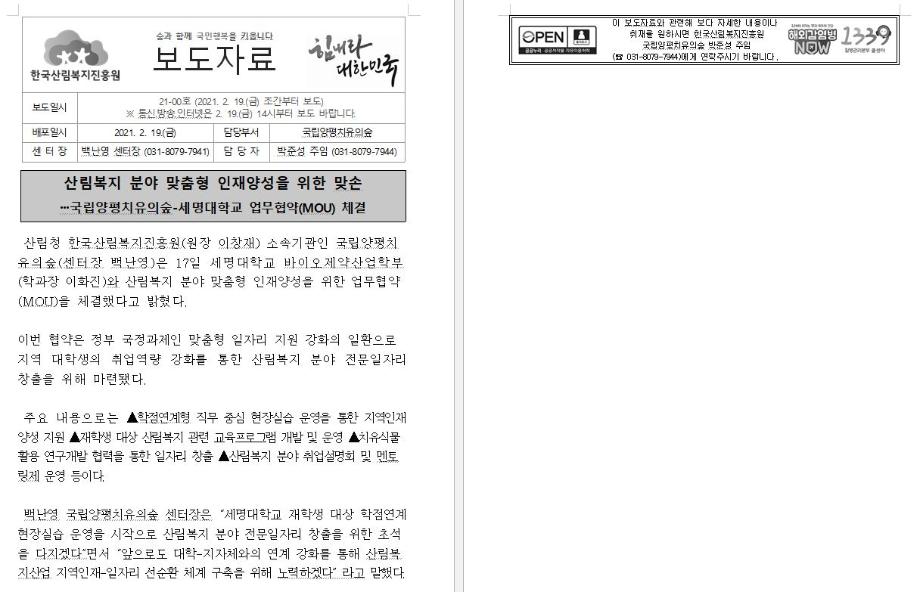 국립양평치유의숲 - 세명대학교 업무협약(MOU) 체결