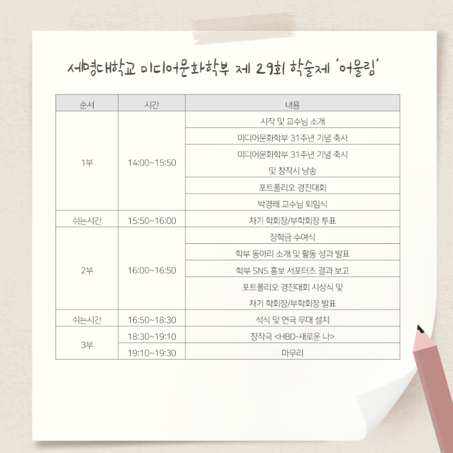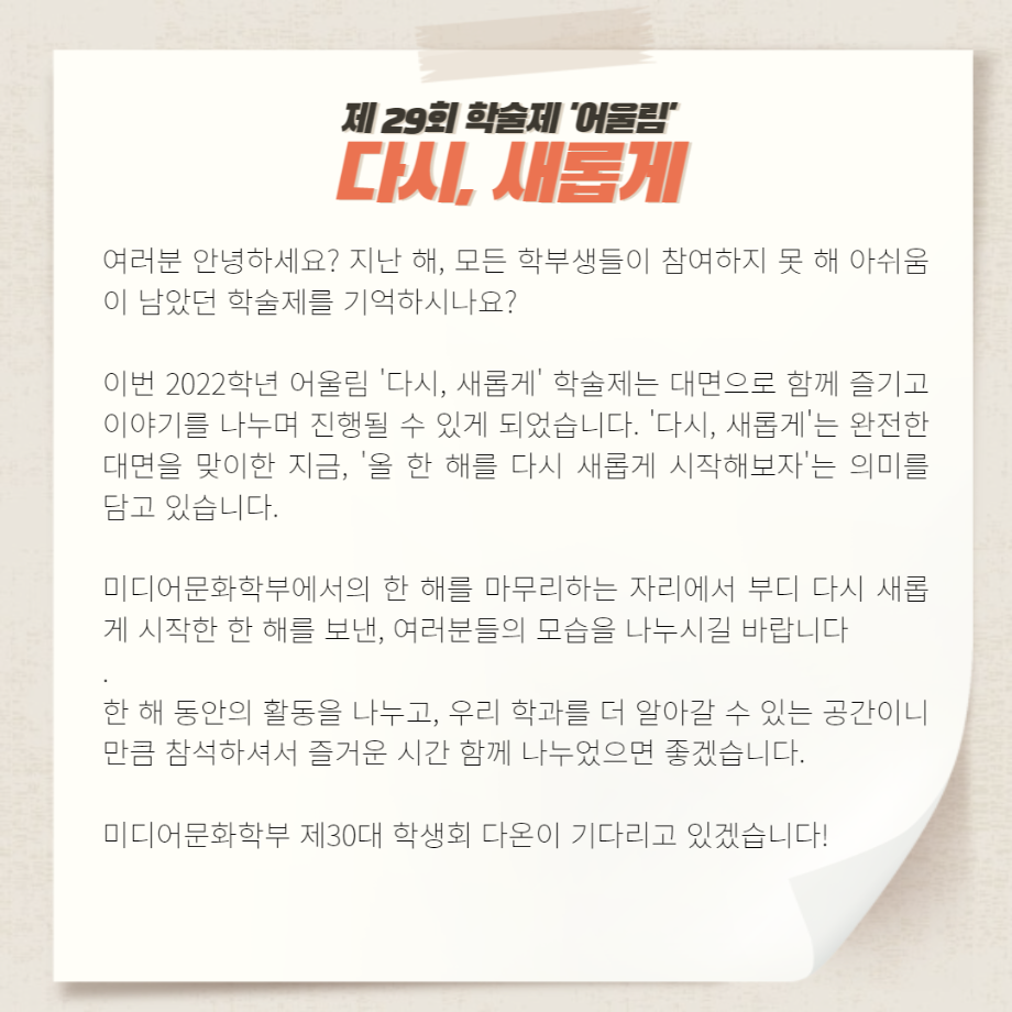 본문 시작 홈으로 학부소식 학부소개 교육과정 학부소식 커뮤니티 홈페이지가이드 학부행사 공지사항 학사일정 학부행사 미문뉴스 미문한컷 포토갤러리 학부행사 페이스북 트위터 프린트 미디어문화학부 학술제 어울림 '다시, 새롭게' 미디어문화학부 3497 2022-11-16 11월 23일 (수) 14:00 학술관 112호에서 미디어문화학부의 가장 큰 행사인 학술제 어울림 '다시, 새롭게'를 진행합니다. 포트폴리오 경진대회, 창작시 낭송, 창작극 그리고 차기 학회장/부학회장 발표도 있을 예정입니다! 🫶 오랜만에 모든 학우분들과 함께하는 대면 행사이기에 많은 참여 및 관심 부탁드립니다! 목록 이전교내외 공모전 안내 다음 미디어문화학부 학술제 어울림 '다시, 새롭게' 담당부서 : 미디어문화학부 담당자 : - 연락처 : 043-649-1760 최종수정일 : 2024-10-26 만족도조사 만족도 조사 이 페이지에서 제공하는 정보에 대하여 만족하시나요? 매우만족 만족 보통 불만족 매우불만족