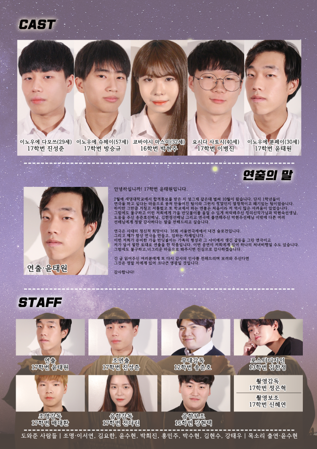 본문 시작 홈으로 커뮤니티 학과소개 교수소개 학과과정 커뮤니티 작품DB 서울대학로 민송아트홀 홈페이지가이드 사진자료실 학과공지 전공자료실 사진자료실 사진자료실 페이스북 트위터 프린트 [공연영상학과] 1학년 하계 워크숍 "가을 반딧불이" 공연영상학과 10511 2017-12-11 - 공연일시: 2017년 10월 11일 오후 7시 태양아트홀 - 정의신 作 - 지도교수: 이정하 - 학생연출: 윤태원 - 배우: 박현주, 진성준, 이병진, 방승규, 윤태원 - 포스터디자인,촬영: 김한정 - 음향디자인,OP: 강현택 - 조명디자인,OP: 전다린, 배대환 - 스텝: 송준호, 정은혁, 신혜연 목록 이전[공연영상학과] 2학년 하계 워크숍 '베니스의 상인' 다음 세명대학교 공연영상학과 제 10회 졸업공연 '트루 웨스트' 담당부서 : 공연영상학과 담당자 : - 연락처 : 043-649-1429 최종수정일 : 2024-10-26 만족도조사 만족도 조사 이 페이지에서 제공하는 정보에 대하여 만족하시나요? 매우만족 만족 보통 불만족 매우불만족