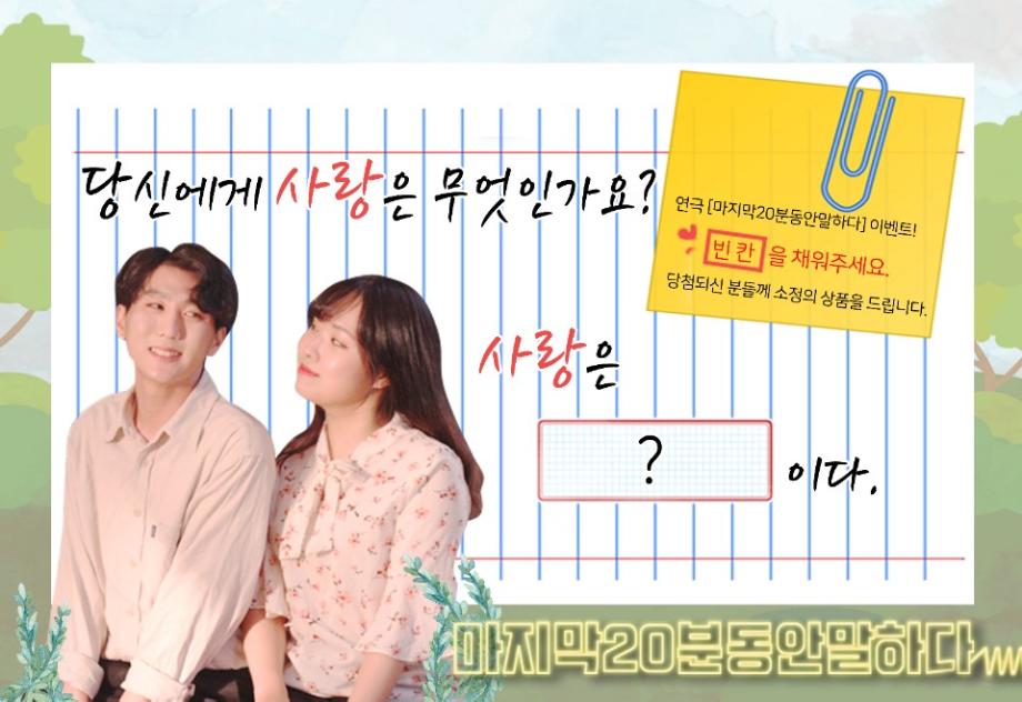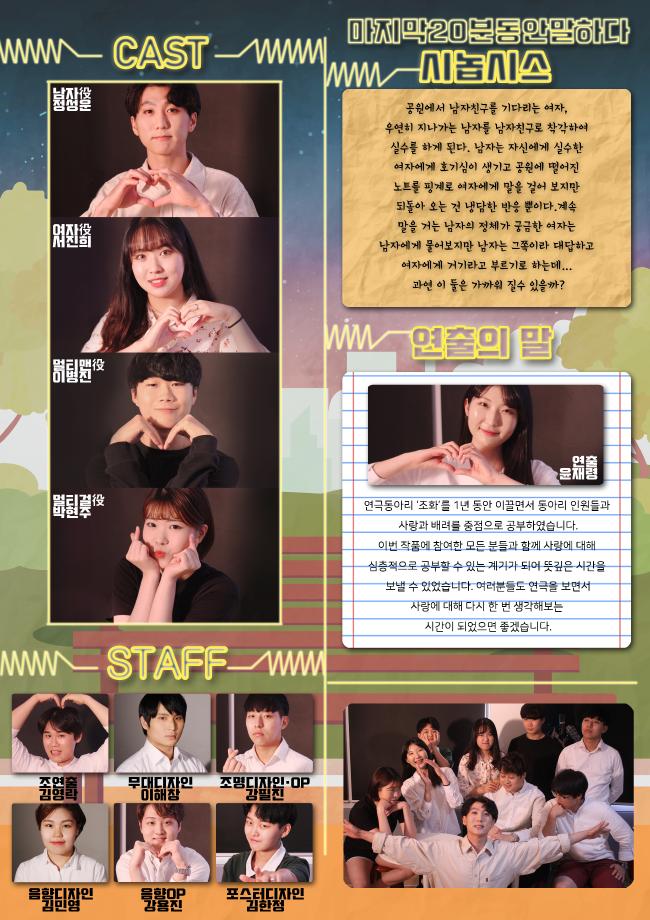 본문 시작 홈으로 커뮤니티 학과소개 교수소개 학과과정 커뮤니티 작품DB 서울대학로 민송아트홀 홈페이지가이드 사진자료실 학과공지 전공자료실 사진자료실 사진자료실 페이스북 트위터 프린트 [공연영상학과] 2018년 하계프로젝트 마지막 20분동안 말하다 공연영상학과 8911 2018-09-06 하계프로젝트 - "마지막 20분동안 말하다" - 공연일시: 2018년 9월 6일오후 7시 태양아트홀 - 작가: 김두용 - 연출: 윤재령 - 조연출: 김영락 - 배우: 정성운, 서진희, 이병진, 박현주 - 무대디자인: 이해창 - 조명디자인,OP: 강필진 - 음향디자인: 김민영 - 음향OP: 강필진 - 포스터디자인: 김한정 목록 이전[공연영상학과] 2018년 2학기 개강총회 이전[공연영상학과] 젊은연극제 참가작 새들은횡단보도로 건너지않는다 담당부서 : 공연영상학과 담당자 : - 연락처 : 043-649-1429 최종수정일 : 2024-10-26 만족도조사 만족도 조사 이 페이지에서 제공하는 정보에 대하여 만족하시나요? 매우만족 만족 보통 불만족 매우불만족