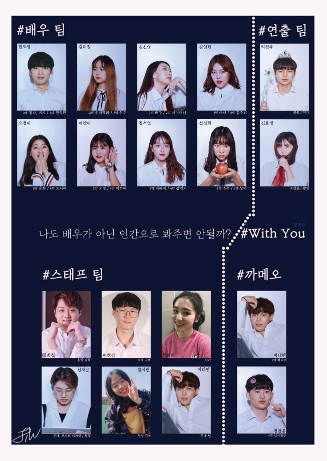 본문 시작 홈으로 커뮤니티 학과소개 교수소개 학과과정 커뮤니티 작품DB 서울대학로 민송아트홀 홈페이지가이드 사진자료실 학과공지 전공자료실 사진자료실 사진자료실 페이스북 트위터 프린트 [공연영상학과] 2018년 하계프로젝트 창작극 #With you 공연영상학과 7642 2018-10-04 하계프로젝트 - 창작극 "#With you" - 공연일시: 2018년 10월 4일 오후 7시 태양아트홀 - 연출/작가: 박찬우 - 조연출: 진효정 - 작가: 김하희 - 무대감독: 이해창 - 무대/포스터디자인: 신재은 - 조명감독: 이병진 - 음향오퍼: 강용진 - 배우: 권도영, 김미정, 김신영, 김임현, 이찬미, 오경미, 장서연, 전진희 목록 이전[공연영상학과] 제 11회 졸업작품 "야끼니쿠드래곤" 다음 [공연영상학과] 2018년 하계프로젝트 버스를놓치다 담당부서 : 공연영상학과 담당자 : - 연락처 : 043-649-1429 최종수정일 : 2024-10-26 만족도조사 만족도 조사 이 페이지에서 제공하는 정보에 대하여 만족하시나요? 매우만족 만족 보통 불만족 매우불만족