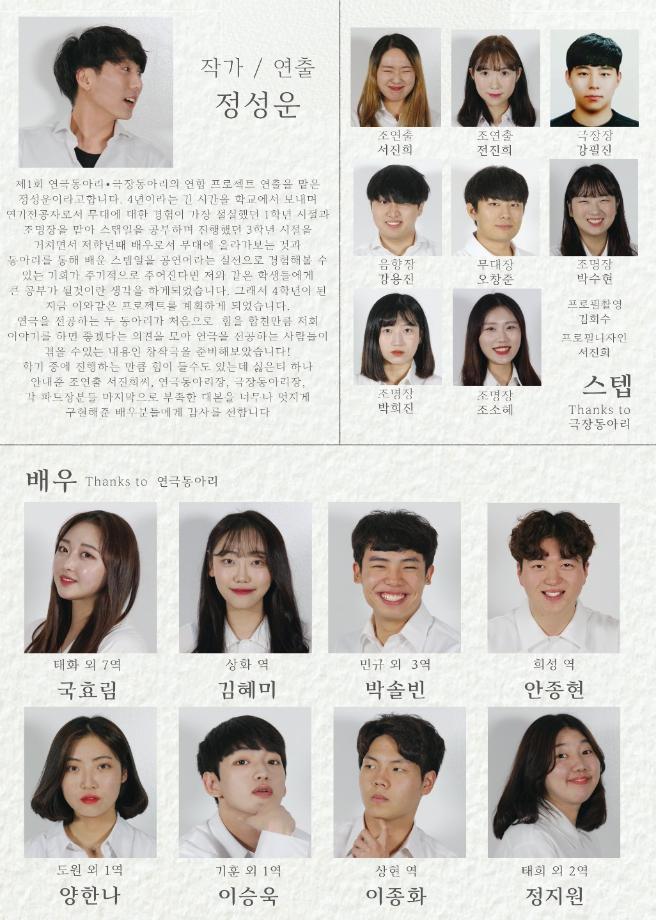 본문 시작 홈으로 커뮤니티 학과소개 교수소개 학과과정 커뮤니티 작품DB 서울대학로 민송아트홀 홈페이지가이드 사진자료실 학과공지 전공자료실 사진자료실 사진자료실 페이스북 트위터 프린트 [공연영상학과] 제1회 극동/연동 합동 프로젝트 "이름에게" 공연영상학과 6423 2019-06-07 작가/연출 : 정성운 조연출 : 서진희, 전진희 극장장 : 강필진 음향장 : 강용진 무대장 : 오창준 조명장 : 박수현, 박희진, 조소혜 프로필촬영 : 김희수 프로필디자인 : 서진희 '태화'외 7역 : 국효림 '상화' 역 : 김혜미 '민규'외 3역 : 박솔빈 '희성' 역 : 안종현 '도원'외 1역 : 양한나 '기훈'외 1역 : 이승욱 '상현' 역 : 이종화 '태희'외 2역 : 정지원 Thanks to, 극장동아리/연극동아리 목록 이전[공연영상학과] 2019 성년의 날 다음 [공연영상학과] 2019년 1학기 뮤지컬제작실습 "지하철 1호선" 담당부서 : 공연영상학과 담당자 : - 연락처 : 043-649-1429 최종수정일 : 2024-10-26 만족도조사 만족도 조사 이 페이지에서 제공하는 정보에 대하여 만족하시나요? 매우만족 만족 보통 불만족 매우불만족