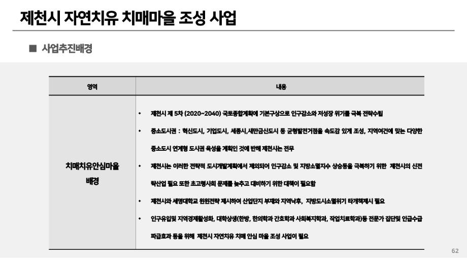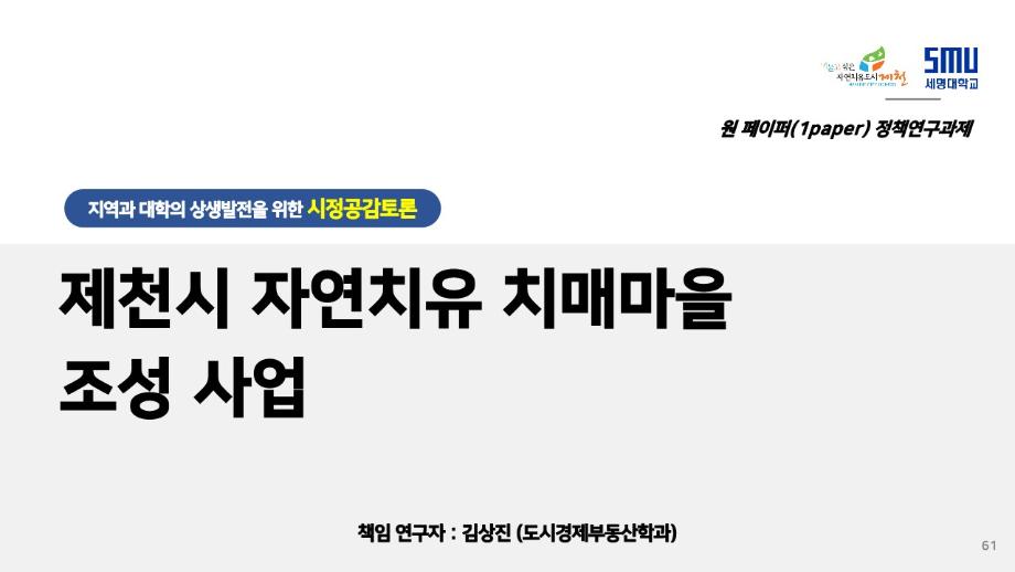 2021년 8월 25일 정부예산 확보 및 정책사업 발굴을 목표로 지역과 대학의 상생발전 연구협력체계 구축을 위한 '제천시 원 페이퍼(1paper) 정책연구과제 공모를 통한 김상진교수님의 '제천시 자연치유 치매마을 조성 사업'이 선정되었습니다.