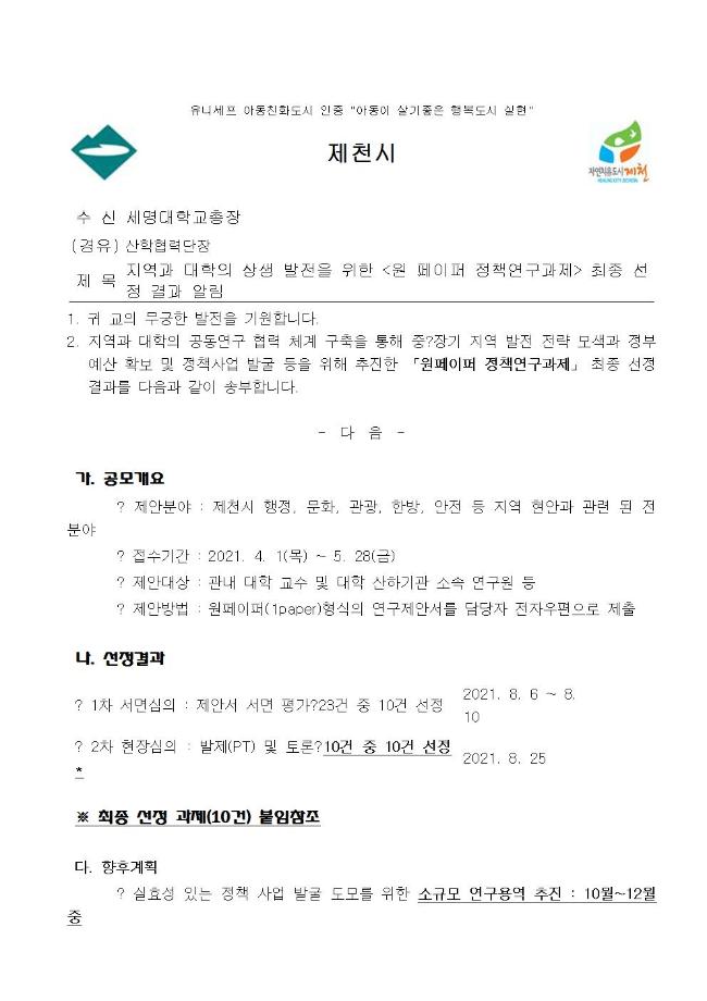 제천시는 관내 대학교수 및 대학 산하기관 소속 연구원 등을 대상으로 추진한 '원 페이퍼(1paper) 정책 연구과제 공모'에서 총 23건의 정책 제안이 되었고 그중 우리 학과 교수님들의 제안이 최종 선정됐습니다.