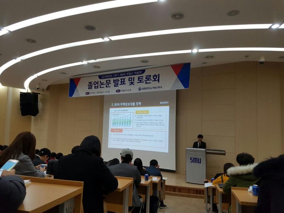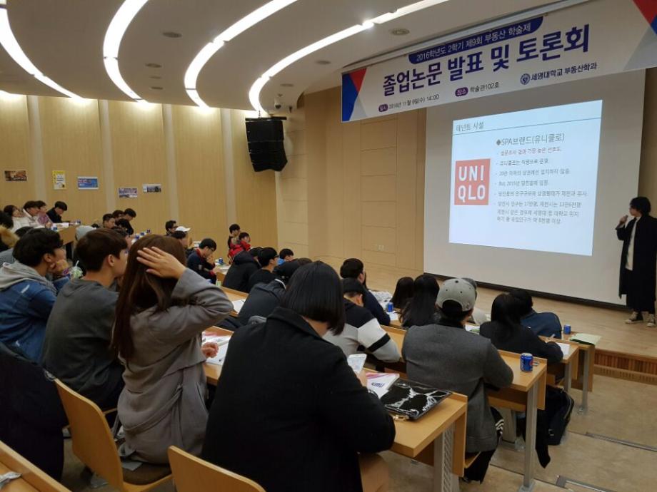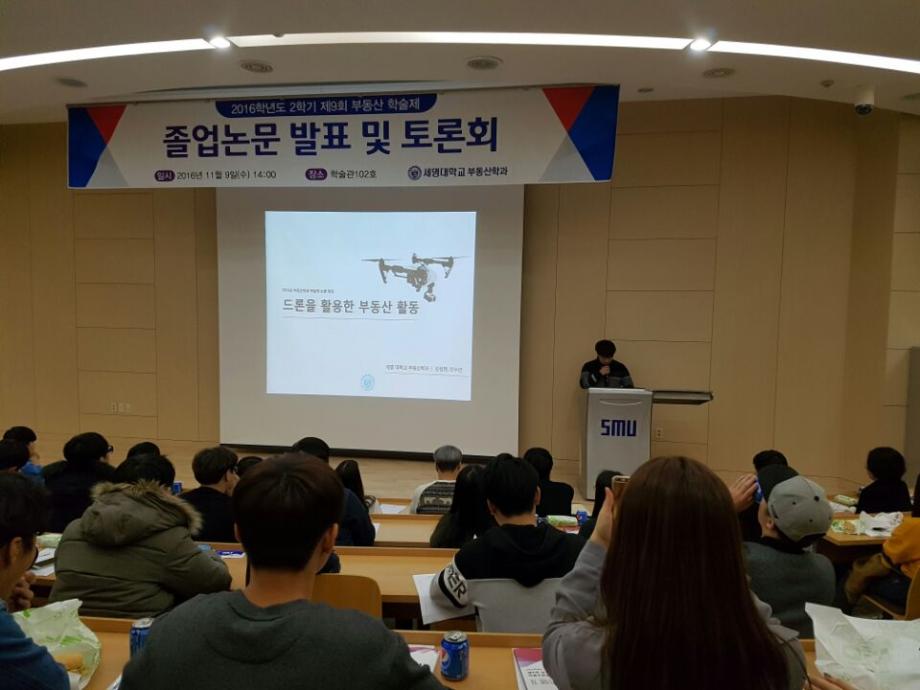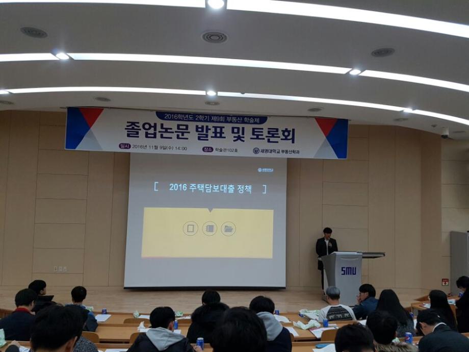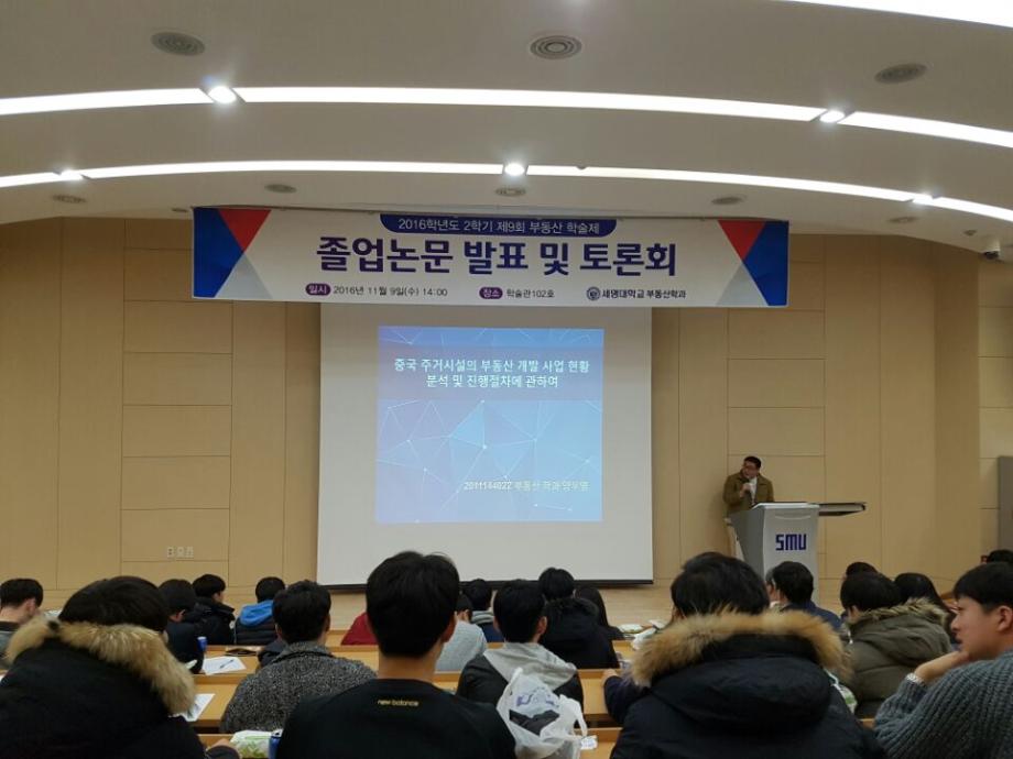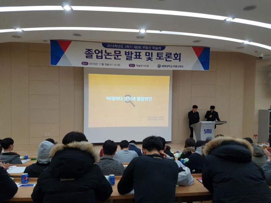 2016년 11월 9일(수) 세명대학교 학술관 102호에서 부동산학과 재학 140여명과 학과 교수님이 참석한 가운데 제 9회 부동산 학술논문발표 및 토론대회를 실시하였다.