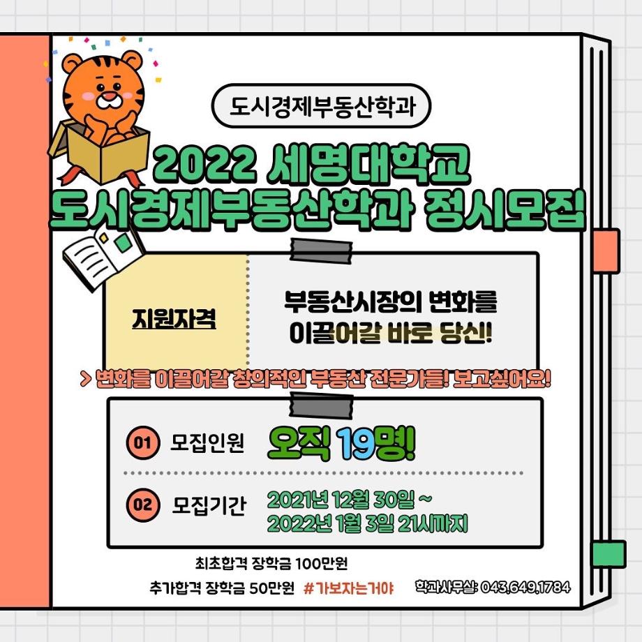 2021년 12월 30일~2022년 1월 3일 21시까지 세명대학교 도시경제부동산학과 정시 모집중입니다.