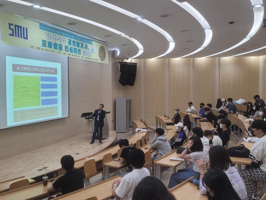 * 내용 : DK빌딩연구소 임동권 대표님께서 도시경제 부동산학과 학생들을 위해 공인중개사의 비전과 꼬마빌딩 중개에 대한 실무영역과 직업소개 특강을 해주셨습니다. 해가 거듭할 수 록 공인중개사 자격증에 대한 가치 상승에 대한 이유와 부동산 중개 구조, 실무, 꼬마빌딩 중개의 장점, 실제 꼬마빌딩 중개 케이스를 설명해 주시며 수익구조에 대하여 자세하게 강의해 주셨습니다. 학생들은 전문가로서 자격 취득을 위해 매년 노력하고 있습니다. 공인중개사 자격증 취득으로 큰 수익을 낼 수 있는 전문직의 길에 도전하는 학생들에게 의미 있는 시간이었습니다.