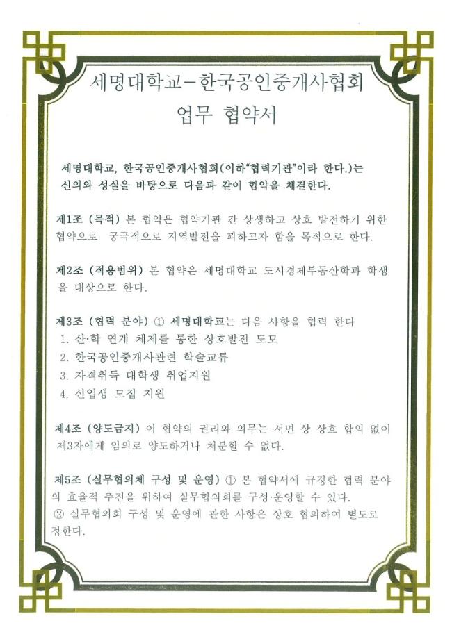 세명대학교(총장 권동현)와 한국공인중개사협회(협회장 이종혁)는 세명대학교 부동산지적학과의 발전을 위하여 상호 협약을 체결하고 다음과 같이 협약하였다.