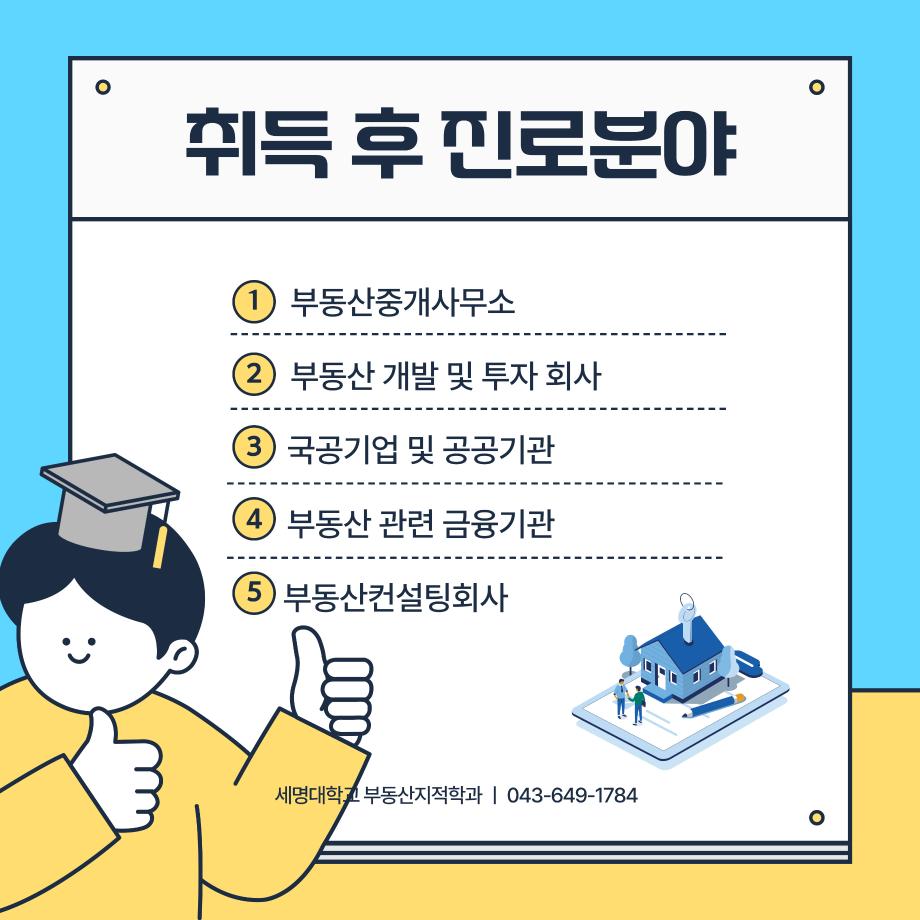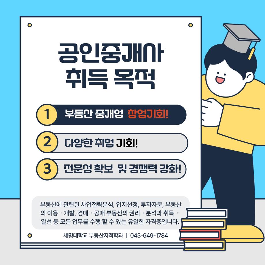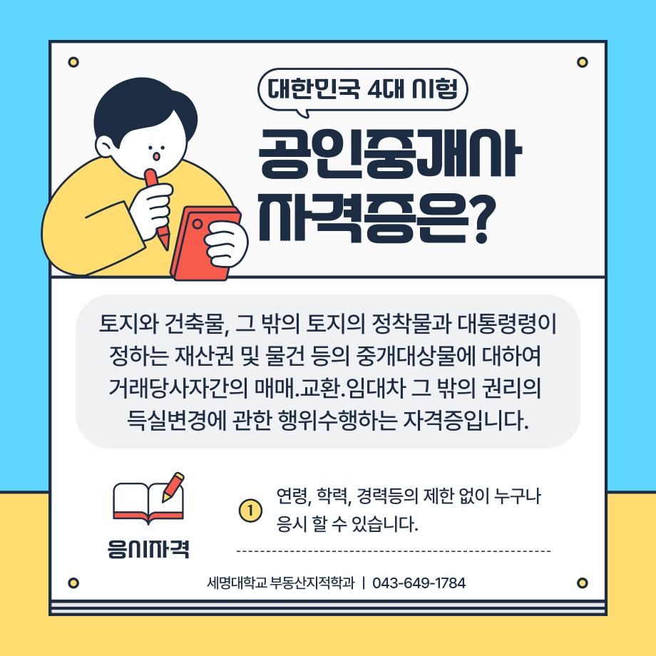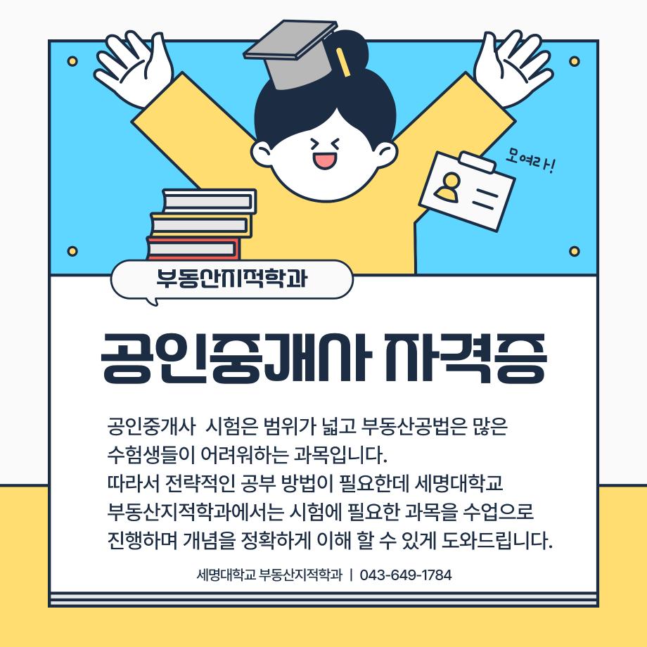 본문 시작 홈으로 학과 소식 학과소개 취업 및 진로 언론 및 보도 학과 소식 대학원 홈페이지가이드 행사사진게시판 행사사진게시판 공지사항 일반자료실 강의자료실 부동산학보 동아리 행사사진게시판 페이스북 트위터 프린트 공인중개사 소개카드 부동산지적학과 2306 2024-11-20 공인중개사 소개 카드입니다. 공인중개사에 관심있는 학생들은 참고하여 주세요. 목록 이전2024학년도 제 35회 부동산지적학과 학술특강 다음 지적기사 소개 카드 담당부서 : 부동산지적학과 담당자 : - 연락처 : 043-649-1784 최종수정일 : 2024-10-26 만족도조사 만족도 조사 이 페이지에서 제공하는 정보에 대하여 만족하시나요? 매우만족 만족 보통 불만족 매우불만족