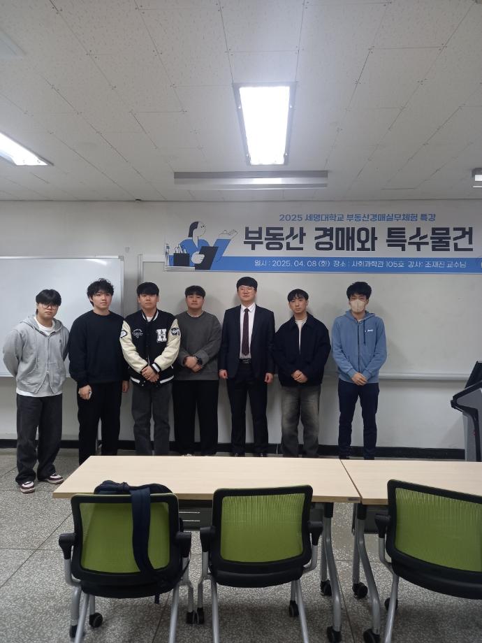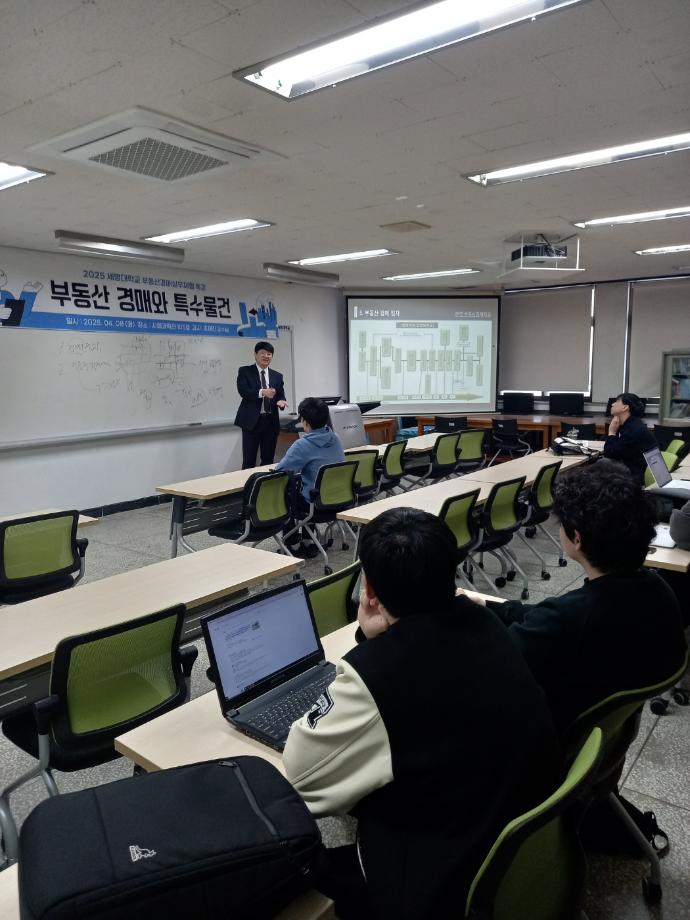 내용 : 세명대학교 조재진교수님께서 부동산경매실무체험에 특강을 해주셨습니다. 학교에서 배우기 어려운 부동산 경매를 전문가의 관점에서 사례와 함께 구체적으로 설명을 해주셨습니다. 학생들은 경매, 공인중개사 분야의 진로에 깊이 고민하고 답을 얻는 시간이였다고 생각합니다.