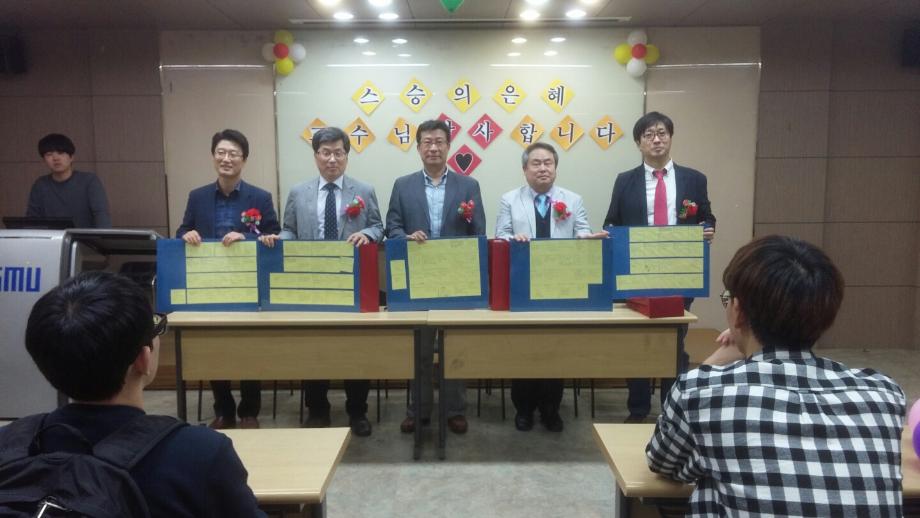 본문 시작 홈으로 학과 소식 학과소개 취업 및 진로 언론 및 보도 학과 소식 대학원 홈페이지가이드 행사사진게시판 행사사진게시판 공지사항 일반자료실 강의자료실 부동산학보 동아리 행사사진게시판 페이스북 트위터 프린트 2016년 스승의날 행사 전체관리자 8437 2016-05-17 2016년 스승의날 행사 일시 : 2016.05.11 장소 : 사회과학관 128호 16 : 00 스승의날을 기념하여 교수님과 재학생들이 한자리에 모였습니다. 모두들 교수님분들께 감사를 표시하며 재학생들은 롤링페이퍼와 작은 선물을 준비하였습니다. 각 학년과대들이 학생들을 대표하여 편지를 낭독하는 시간을가졌으며 마지막으로는 스승의은혜를 다같이 부르며 마무리하였습니다. 교수님 감사합니다~~~!! 목록 다음 2016 청룡체전 이전2016학년도 1학기 책임지도교수제 단체행사 개최 담당부서 : 부동산지적학과 담당자 : - 연락처 : 043-649-1784 최종수정일 : 2024-10-26 만족도조사 만족도 조사 이 페이지에서 제공하는 정보에 대하여 만족하시나요? 매우만족 만족 보통 불만족 매우불만족