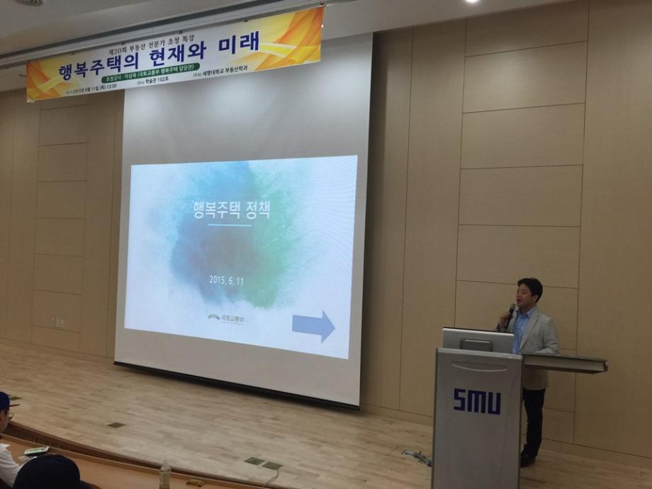 부동산학과(학과장 권기욱 교수)는 2015년 6월 11일(목) 세명대학교 학술관 102호에서 국토교통부 행복주택정책과 이상욱 사무관을 초빙하여 “행복주택 현재와 미래”란 주제로 특강을 실시하였다.