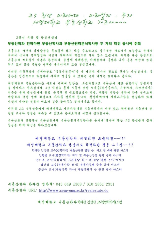 본문 시작 홈으로 학과 소식 학과소개 취업 및 진로 언론 및 보도 학과 소식 대학원 홈페이지가이드 행사사진게시판 행사사진게시판 공지사항 일반자료실 강의자료실 부동산학보 동아리 행사사진게시판 페이스북 트위터 프린트 세명대학교 부동산학과 수시 입시자료 부동산학과 6311 2020-09-21 세명대학교 홈페이지에 있는 2021학년도 세명대학교 수시 입시자료입니다. 2021년도 입시에서 세명대학교 진학을 희망하는 예비 신입생, 부모님, 선생님 및 관심 있으신 분들께서는 참조해주시면 감사드리겠습니다. 목록 이전제 5 회 공간정보 활용 창업 아이디어 공모전 다음 LH, '남북교류와 미래 국토비전' 작품 공모전 개최 담당부서 : 부동산지적학과 담당자 : - 연락처 : 043-649-1784 최종수정일 : 2024-10-26 만족도조사 만족도 조사 이 페이지에서 제공하는 정보에 대하여 만족하시나요? 매우만족 만족 보통 불만족 매우불만족