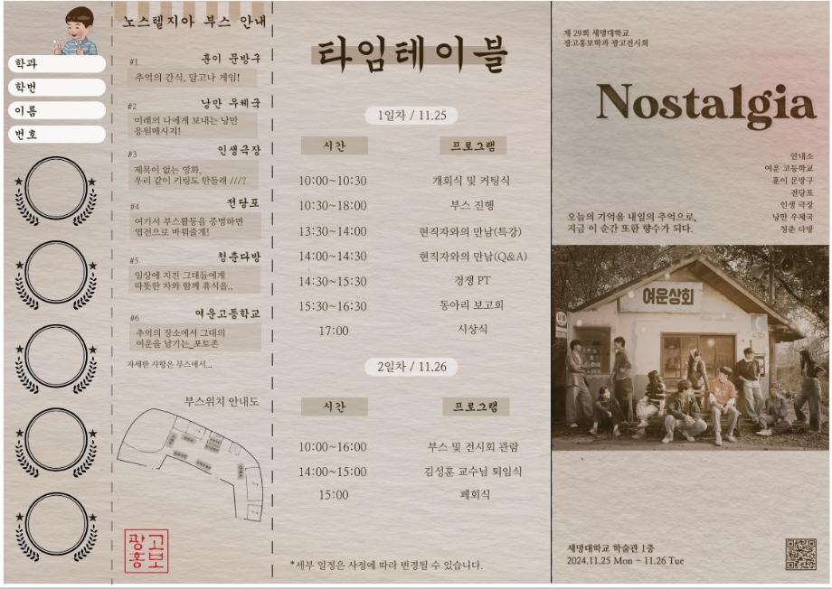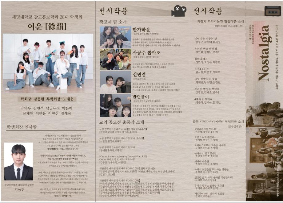 본문 시작 홈으로 특별CC프로그램 매력적인 학과소개 흥미로운 교육과정 특별CC프로그램 We can 취업 따뜻한 커뮤니티 홈페이지가이드 광고전시회 광고전시회 광고영상 제작실습 광고디자인 자격증취득 C&E(도전!경험!) 작품 작품 활동 작품 페이스북 트위터 프린트 [2024년도]제29회 광고전시회 광고홍보학과 3959 2024-12-04 제29회 광고전시회 노스탤지아 목록 이전[2023년도]제28회광고전시회 다음 [2025년도]제30회광고전시회