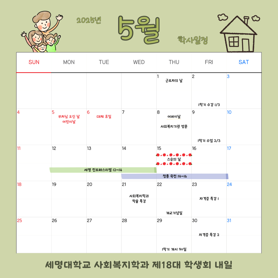 본문 시작 홈으로 커뮤니티 학과소개 교수소개 교육과정 현장실습 및 취업정보 커뮤니티 홈페이지가이드 학사일정 학과공지 학사일정 학생회 동아리 학생 소통 광장 포토갤러리 전공자료실 서식자료실 학사일정 페이스북 트위터 프린트 5월 학사 일정 사회복지학과 777 2025-09-04 2025학년도 5월 학사 일정입니다. 목록 이전4월 학사 일정 다음 6월 학사 일정 담당부서 : 사회복지학과 담당자 : - 연락처 : 043-649-1799 최종수정일 : 2024-10-26 만족도조사 만족도 조사 이 페이지에서 제공하는 정보에 대하여 만족하시나요? 매우만족 만족 보통 불만족 매우불만족