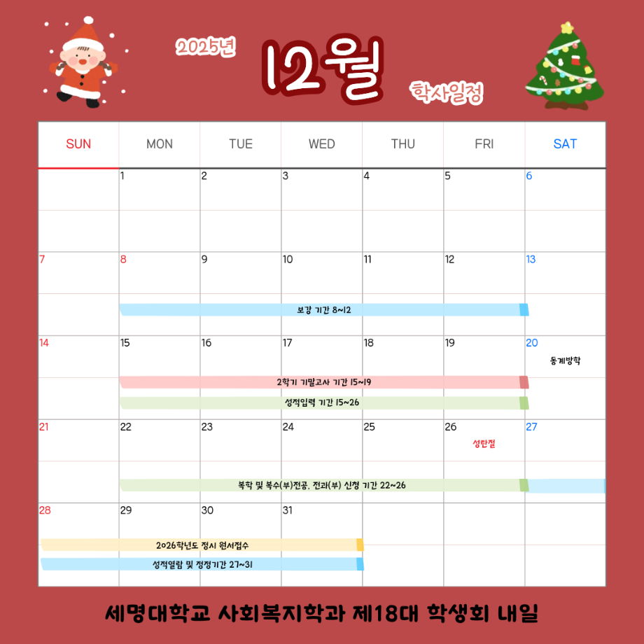 본문 시작 홈으로 커뮤니티 학과소개 교수소개 교육과정 현장실습 및 취업정보 커뮤니티 홈페이지가이드 학사일정 학과공지 학사일정 학생회 동아리 학생 소통 광장 포토갤러리 전공자료실 서식자료실 학사일정 페이스북 트위터 프린트 12월 학사 일정 사회복지학과 647 2025-12-03 12월 학사 일정 입니다. 목록 이전11월 학사 일정 다음 2월 학사 일정 담당부서 : 사회복지학과 담당자 : - 연락처 : 043-649-1799 최종수정일 : 2024-10-26 만족도조사 만족도 조사 이 페이지에서 제공하는 정보에 대하여 만족하시나요? 매우만족 만족 보통 불만족 매우불만족